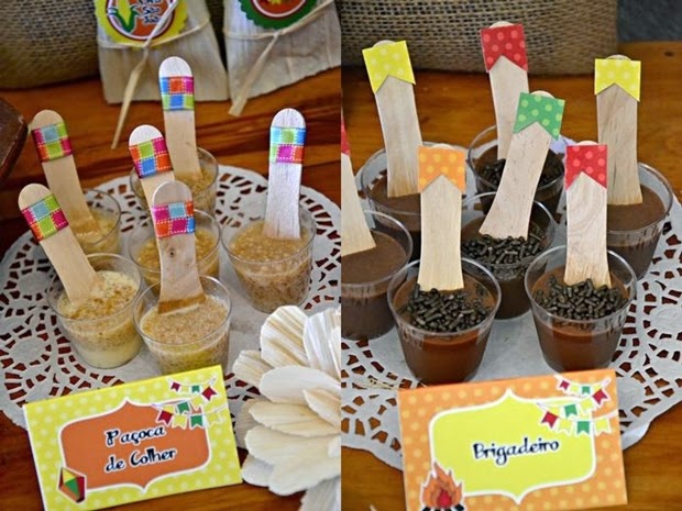 Comidinhas: bolo de fubá, canjica, cocada, maçã do amor, paçoquinha, pé-de-moleque, rapaduras, maria-mole, arroz doce, cuscuz, milho verde, queijadinha, e claro: a pipoca caramelada e salgada, são algumas sugestões que você pode preparar em casa ou comprar na loja de doces mais próxima.
