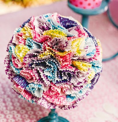 Para centro das mesas dos convidados e para a mesa principal, use vidros de conserva e garrafas como vasos para as flores, que podem ser naturais ou de papel. Outra opção: topiarias feitas com forminhas de cupcake:
