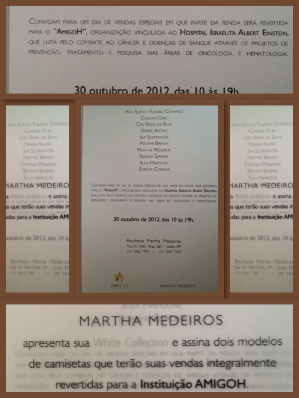 Na ocasião, estarão a venda dois modelos de camisetas assinadas by Martha Medeiros, que terão suas vendas integralmene revertidas para a Instituição Amigoh, que é uma organização vinculada ao Hospital Israelita Albert Einstein que luta pelo combate ao câncer e doenças de sangue através de projetos de previsão, tratamento e pesquisa nas áreas de oncologia e hematologia. PARTICIPE DESTA CAUSA!!