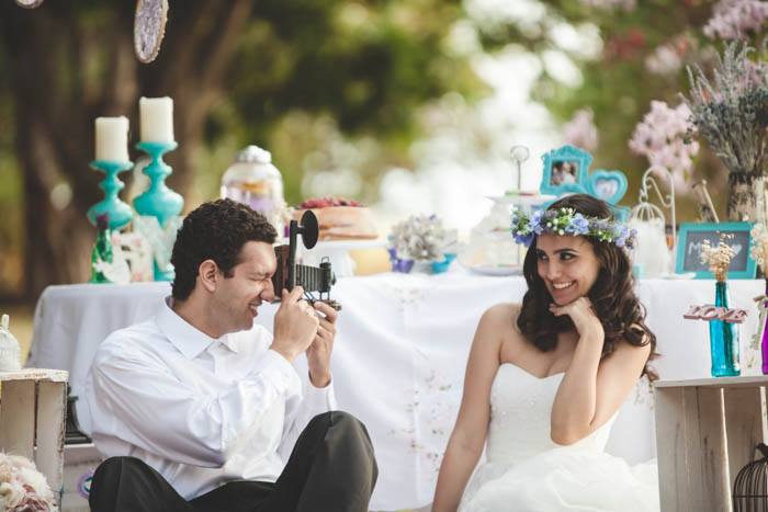 Mas solucionei o dilema (hihihi) da seguinte forma: Percebi que essa não precisa ser a única nem a última sessão externa das nossas vidas! Eu posso futuramente ter o privilégio de me vestir de noiva por mais algumas horas! (Afinal, uma vez noiva, sempre noiva!) ♥ E pensando calmamente no que mais teria a ver conosco e no que teria realmente a nossa cara não tive dúvidas: um cenário típico de fotos americanas com mesa, cadeiras, guloseimas e objetos que fizessem parte ou representassem algo da nossa história!