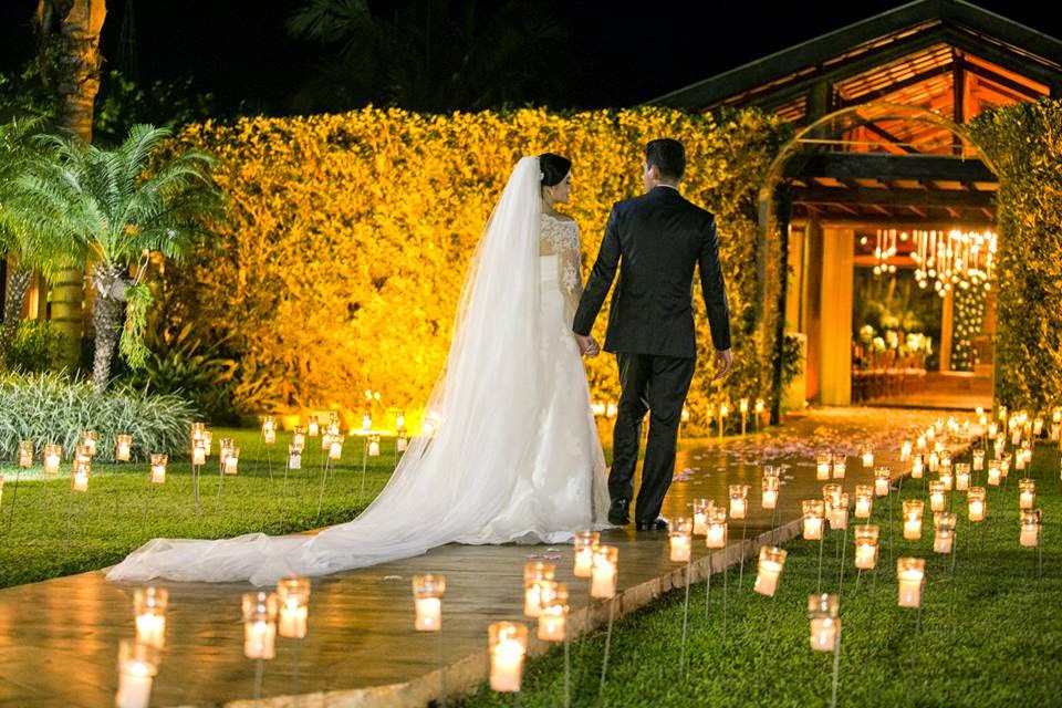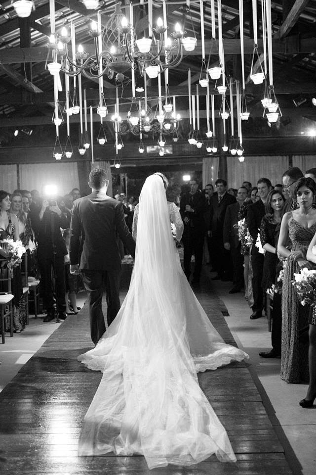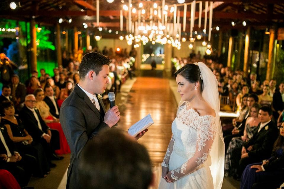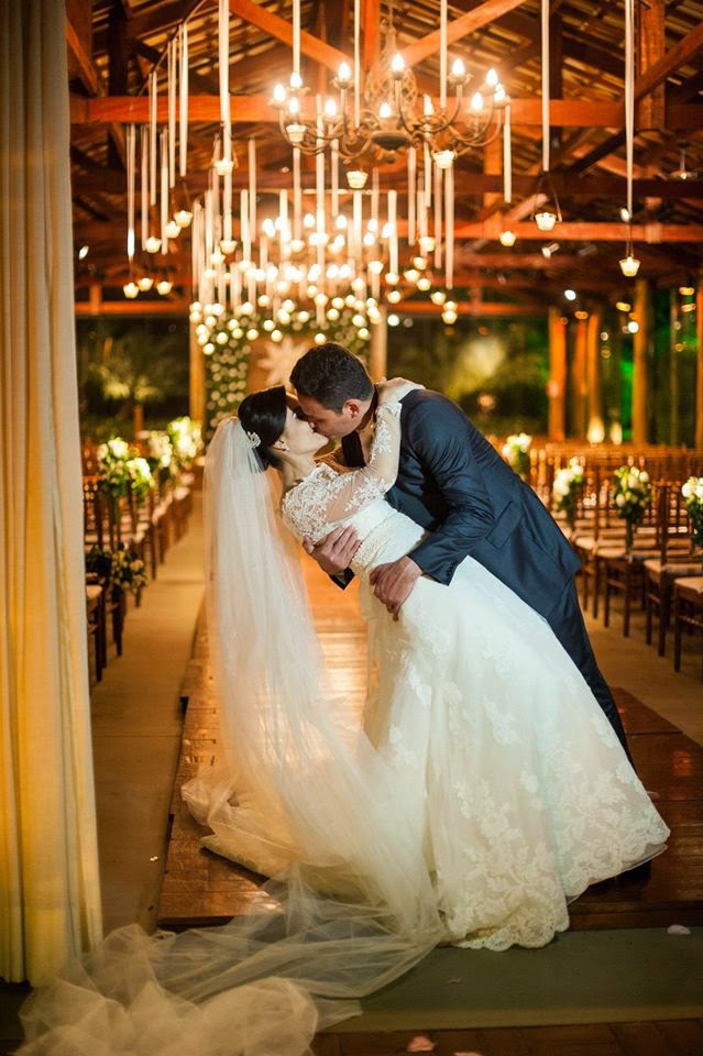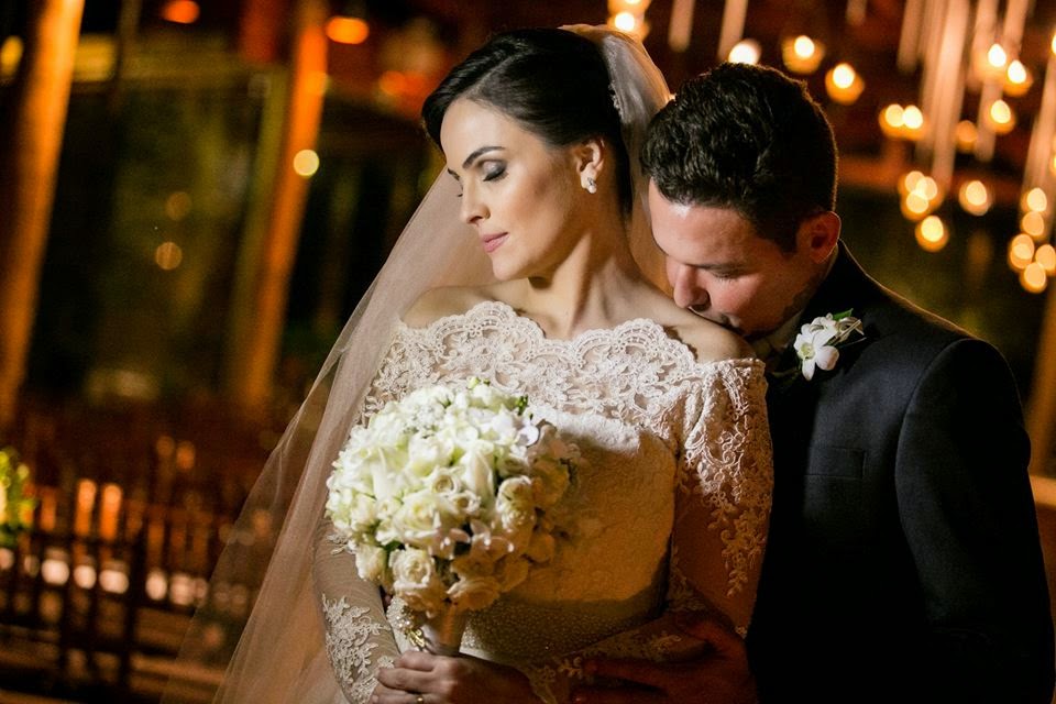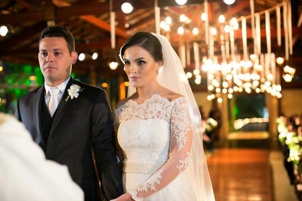 A noiva vestiu um lindo vestido com renda e decote ombro a ombro da Pronovias e o noivo Ricardo Almeida.