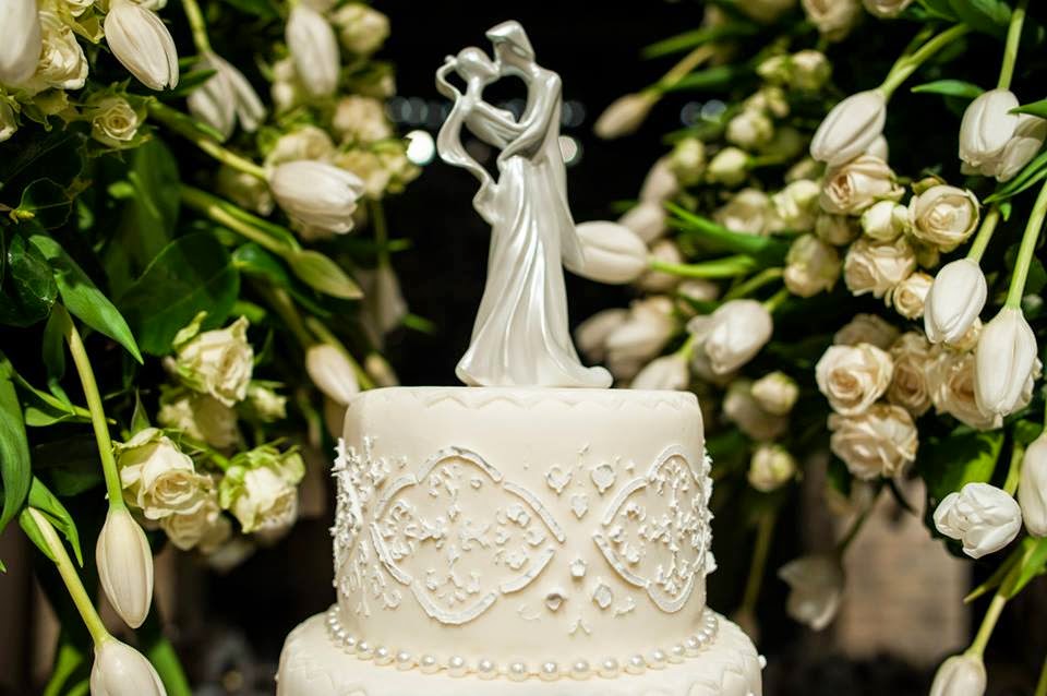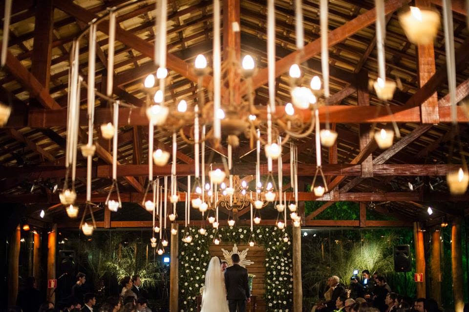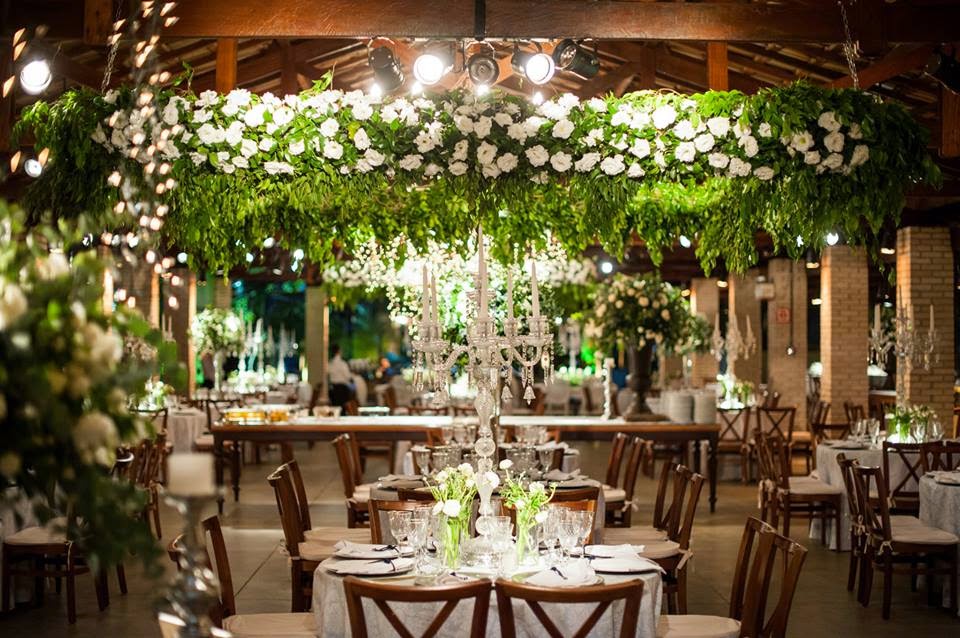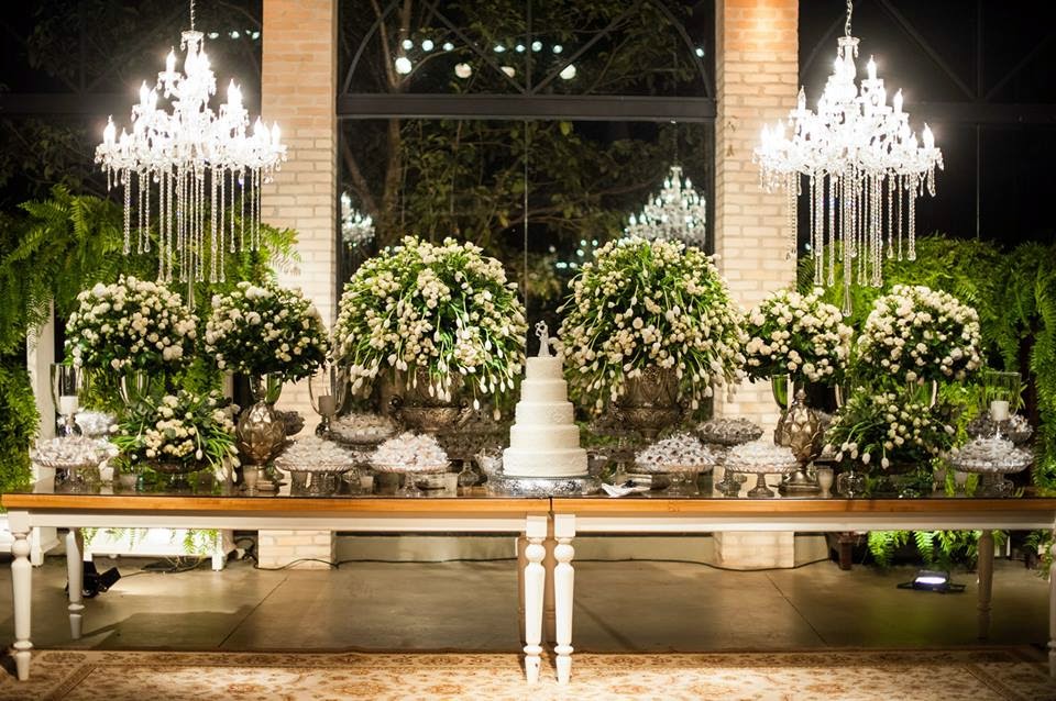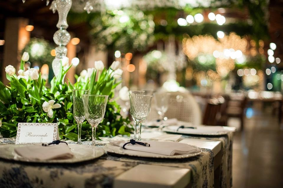 Flores brancas, plantas, arranjos florais e velas suspensas, lustres e objetos de cristal e a iluminação impecável, conferiram elegância e delicadeza ao ambiente.