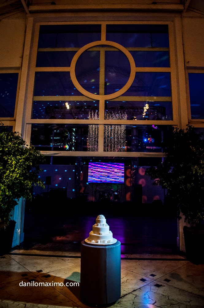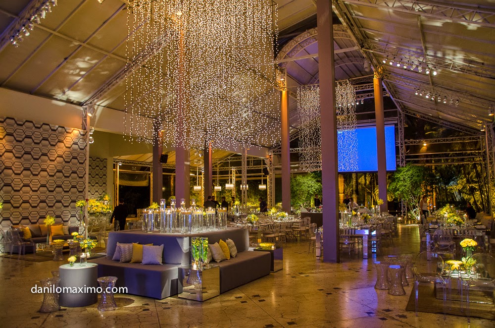 O mobiliário transparente, as mesas redondas para os doces ao invés de uma mesa só retangular, o tecido escolhido para a forração de algumas paredes, os lustres redondos de cristal, os fios de luzes em formato de chuva de ouro que vinha do teto.