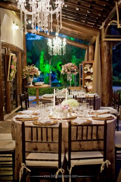 As sócias da Brunello Eventos (Liliane Brunello e Cíntia Ferraz) fizeram os porta guardanapos da mesa dos noivos com pérolas e lacinhos de strass (e depois, fofas, nos presentearam com eles), capricharam na decoração do lustre do salão principal, com folhagens, flores e pérolas (as pérolas também estavam presentes nos arranjos florais das mesas) e criaram ambientes aconchegantes em diversos cantinhos do sítio.