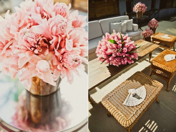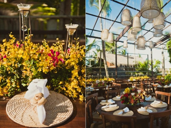 A decoração do casamento da Bruna e do Ricardo, realizada por Valéria Leão Bittar, priorizou o aspecto tropical, utilizando lindas flores exóticas em tons de vermelho, rosa e amarelo.