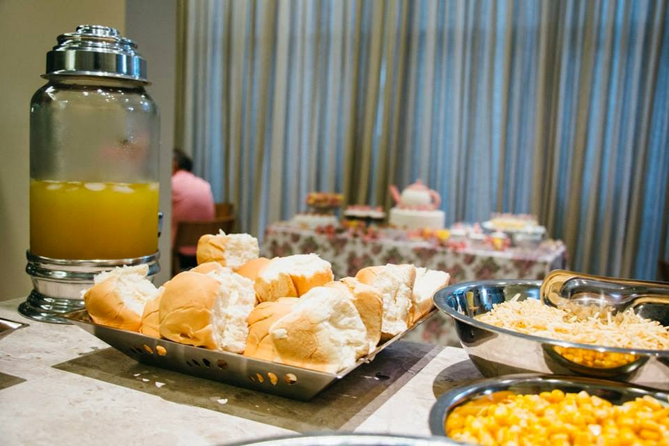 Encomendei algumas comidas (sanduíche de metro, salgados assados e mini hamburguer), mas a minha mãe, amiga e tias também fizeram muitos quitutes saborosos (torta de frango, de presunto e queijo, limão, pates, cachorro-quente, empadinhas, e bolos de vários sabores). Além disso teve cachorro quente, chocolate quente, vários sucos, refri e café.