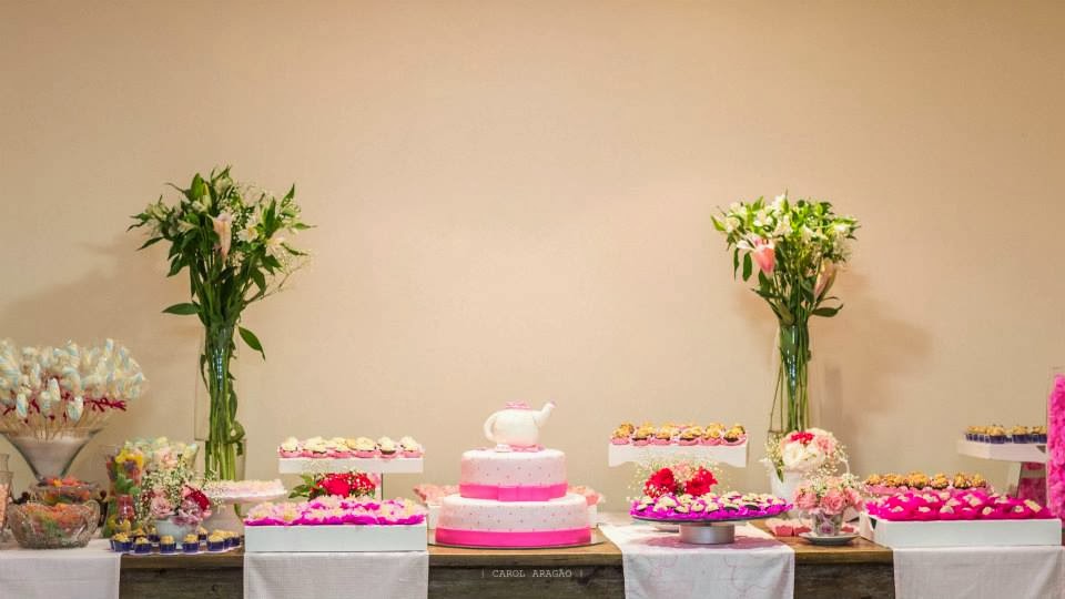 A Clarissa ainda tem a sorte de ter amigas queridas que fizeram toda a decoração do espaço com xícaras e bules, além das lembrancinhas e docinhos!