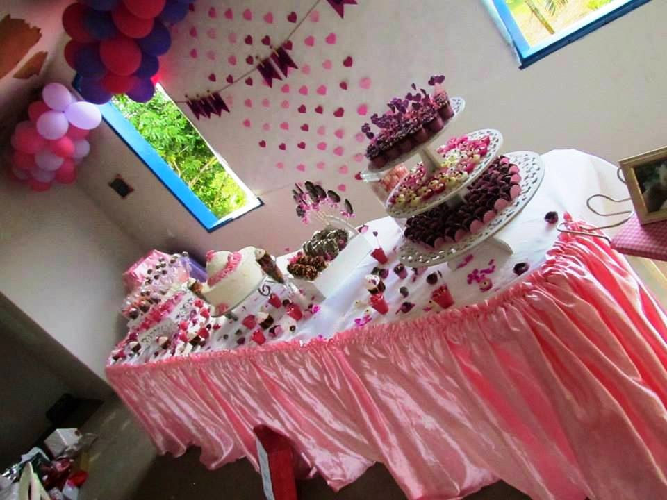 A paleta de cores escolhida para a decoração foi rosa e lilás. No teto, colocamos balões e um painel com um varal feito pela minha prima emprestada e um varal de coraçãozinhos confeccionado pela minha melhor amiga e futura madrinha rs. Na mesa dos convidados coloquei uma balãozinho de coração super fofo. Fizemos brigadeiro, cajuzinho e doce de leite ninho.. ficaram uma delícia. Coloquei os brigadeiros em copinhos com colherzinhas transparentes e arrematei com um coraçãozinho de e.v.a. Os doces personalizados foram comprados.
