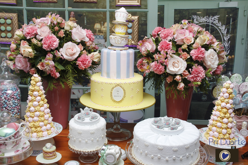 Foi exatamente isso que aconteceu neste Chá de Panela: com base nos tons pastel que representam a loja e seus produtos, ela criou um ambiente romântico, lindo e que dava a sensação de estar tomando um belo chá na própria loja da marca em Paris! Detalhe para os macarons produzidos pela Chocolateria Brasil especialmente para a ocasião, assim como as torres do quitute, que ficaram um verdadeiro luxo!