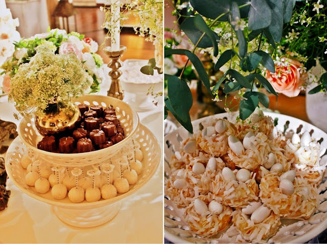 A ideia da decoração era que ela fosse o mais branca possível. Fizemos isso com o uso do mobiliário quase todo nessa cor, apenas com as cadeiras douradas e um pouco de rosa e chá nos arranjos.