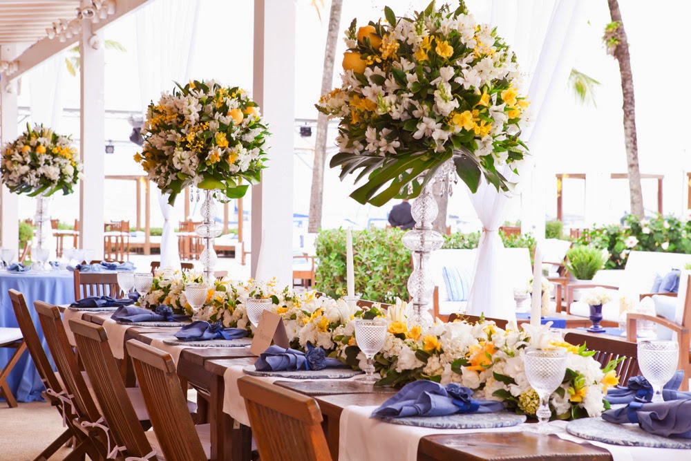 Os arranjos da festa foram mesclados com hortênsias, chuva de ouro ( amarelo), rosas, alstromerias, lírios, folhas de eucalipto, folhas de costela de adão e frutas como o limão siciliano ( amarelo).