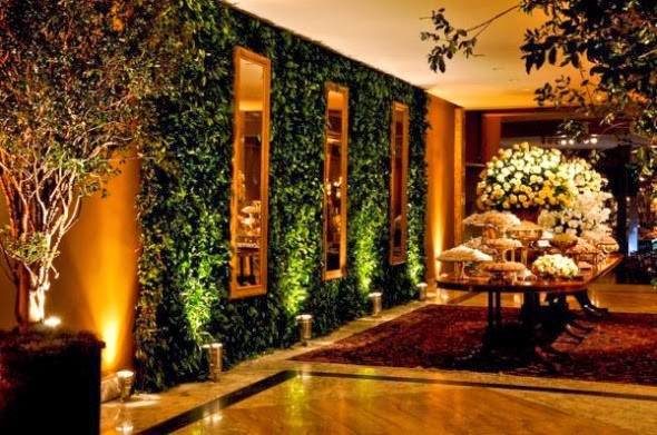 Invista em soluções verdes, em jardins verticais para revestir paredes de espaços de festa.