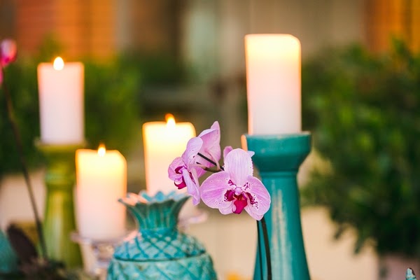 No centro, castiçais de vidro e o enfeite Abacaxi turquesa, da Empório Felicitá, ao lado do castiçal de cerâmica azul da Vagalumes & Pirilampos. |