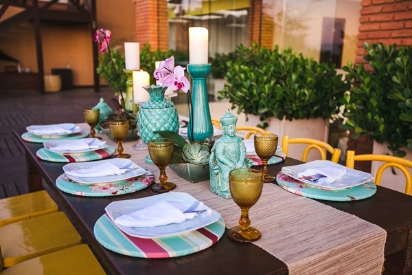 DECORAÇÃO DE CASAMENTO EM BÚZIOS Como disse antes, não sou fã de decorações temáticas. Mas adoro usá-los como leve inspiração, sempre dando um toque pessoal pra não deixar tudo mergulhado no tema e sem nenhuma personalidade. Nessa mesa a inspiração foi mais étnica, mantendo o uso da mesa de madeira e fibras naturais para conseguir um efeito mais próximo das decorações dos países do sudeste asiático, como a Indonésia e Tailândia. A ideia começou a ganhar vida a partir de um conjunto de castiçais com a minha combinação de cores preferida (azul e verde), que junto com as cadeiras austríacas na cor amarela deixou a coisa toda com uma cara mais cool, divertida e menos temática. Unimos a isso os sousplats forrados, parte com listras nas cores azul turquesa + carmin, e parte de um floral em tons que lembram a cerejeira – uma planta tradicional de origem asiática, que no Japão simboliza a beleza do amor e, na Índia, a fartura – e resolvi dizer que temos uma mesa étnica, cool, moderna e divertida, tudo ao mesmo tempo! Só porque não curto rótulos e acho que a gente sempre pode ser o que quiser. Sempre com personalidade!
