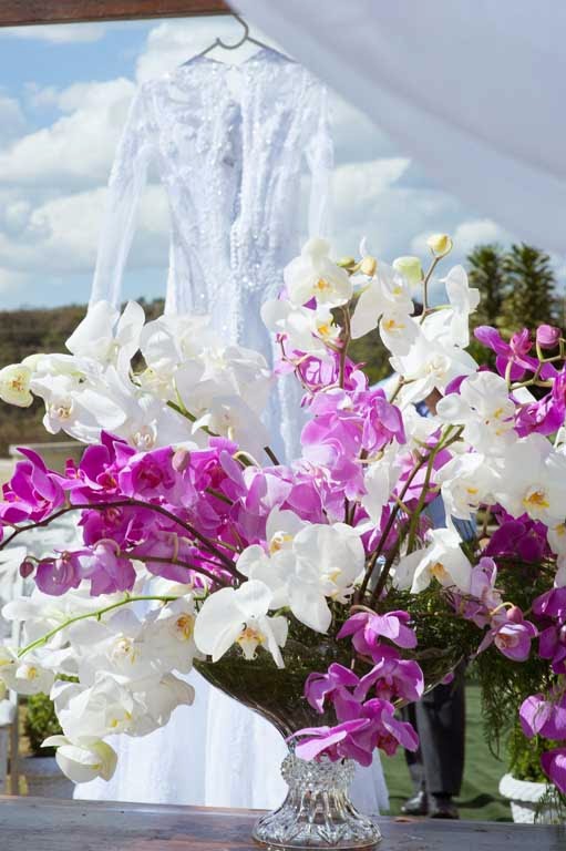 Desde o início do noivado idealizávamos um casamento mais despojado, sem tantos protocolos e formalidades. Apaixonada por casamentos com um estilo rústico-elegante, acabamos optando por fazer o nosso casamento ao ar livre, numa chácara no fim de tarde.