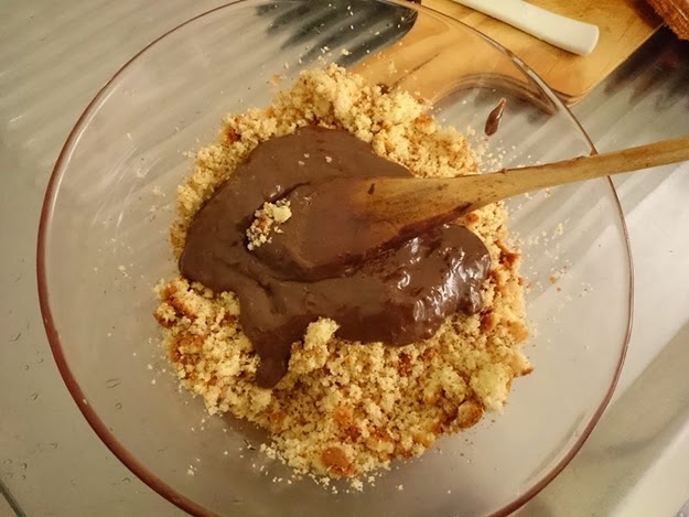DICA: não coloque as quantidades totais de uma vez, comece pela metade do bolo e vá adicionando aos poucos o brigadeiro até acertar o ponto de um mistura que não fique grudenta demais nem seca demais: