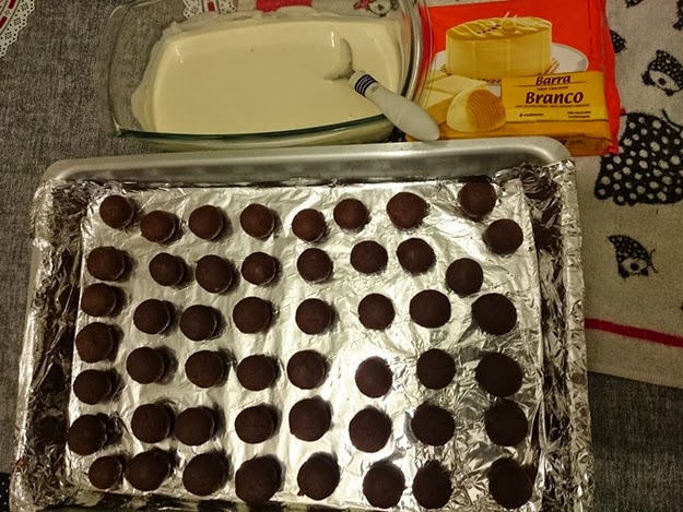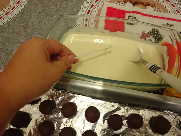 Com a ajuda de uma colher, banhe as bolinhas no chocolate: