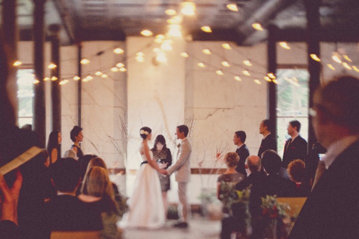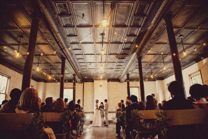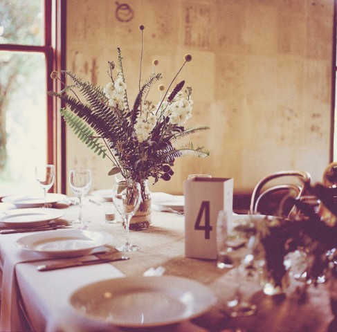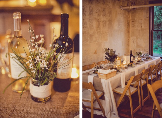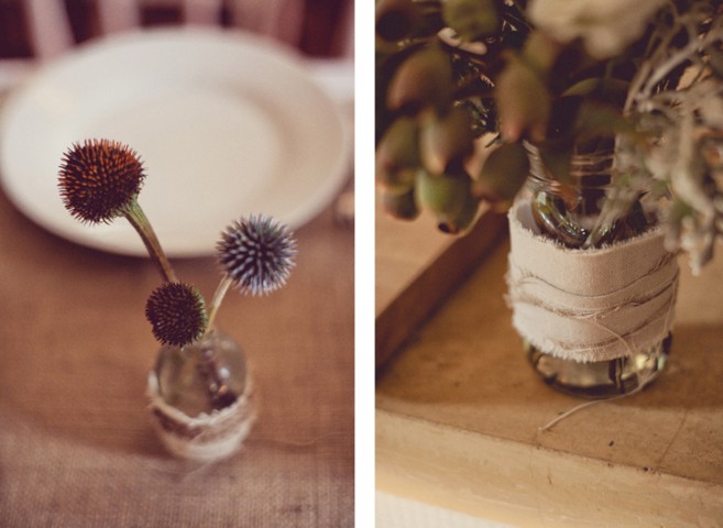 Reparem que toda a decoração foi feita com garrafas de vidro. Algumas envolvidas com pedaços de tecido cru e ráfia. As plantas do arranjo são nada mais que folhas de samambaias misturadas com flores. Além disso, o ambiente estava todo decorado com lâmpadas através de longos fios que deixam um efeito muito legal nas fotos.