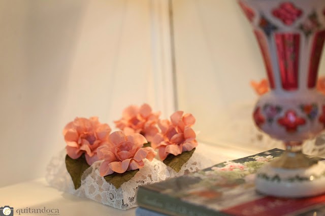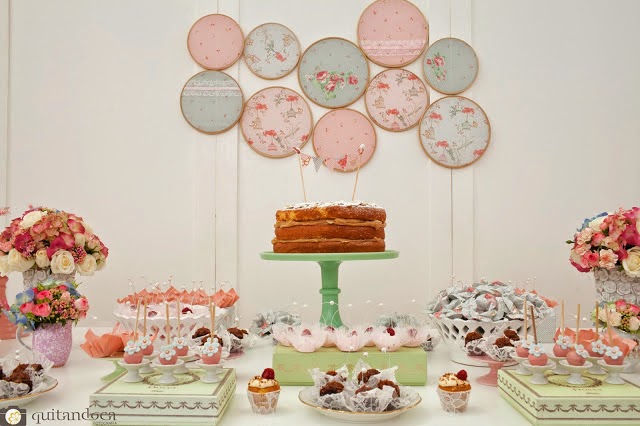 Tempo depois me deparei com o lindo trabalho da Bella Fiore e o aniversário da Kelly Pinheiro, seguindo a linha Sabby Chic. Como ela mesmo define, “este tipo de decoração é o uso de cores pastéis, tecidos florais delicados e itens de decoração vintage”. Por coincidência, ela utilizou do mesmo tecido para a composição de toda a decoração.