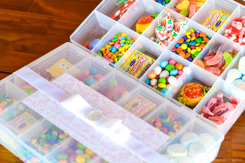- “Caixa de guloseimas” – O verdadeiro paraíso infantil! Uma caixa de PVC bem grande, com divisórias, repleta de doces e doçuras que farão as crianças não só entrarem no casamento, mas até mandar beijo para as fotos, se souberem o que as espera..rs! É muita delícia numa caixa só, confiram: