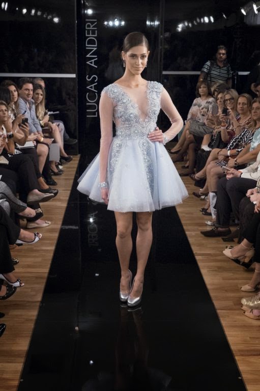 Silhueta bem estruturada, saias volumosas, caudas e detalhes elegantes como laços, bordados de pedraria, aplicações de renda rebordadas e transparências são os destaques da coleção. As cores são: nude, azul, off-white, prata e preto.