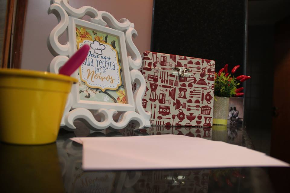 Os noivos optaram por utensílios domésticos em dourado para compor a mesa do bolo junto aos suportes de doces e arranjos florais preparados pela noiva. Tábuas de carne viraram porta-retratos e biscoitinhos em formato de rolo de massa e corações deixaram tudo muito fofo.