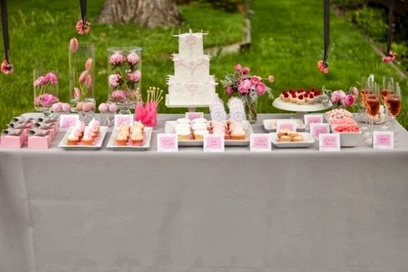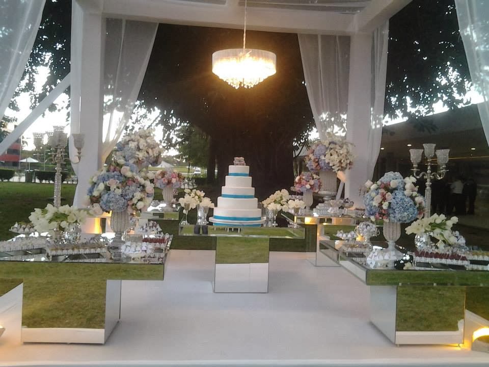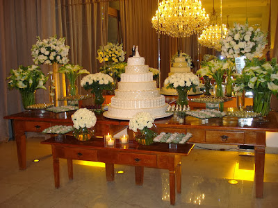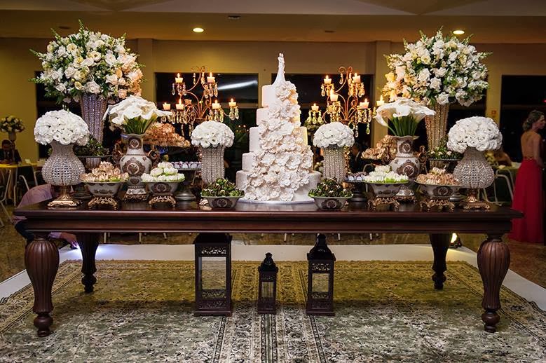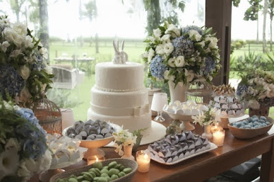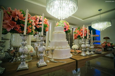 Não importa o estilo que você escolha, o importante mesmo é ter bom senso e coerência, se você irá fazer um mini wedding a mesa do bolo deve seguir o mesmo estilo. Bolo com poucos andares, alguns doces e arranjos florais discretos são a combinação ideal.