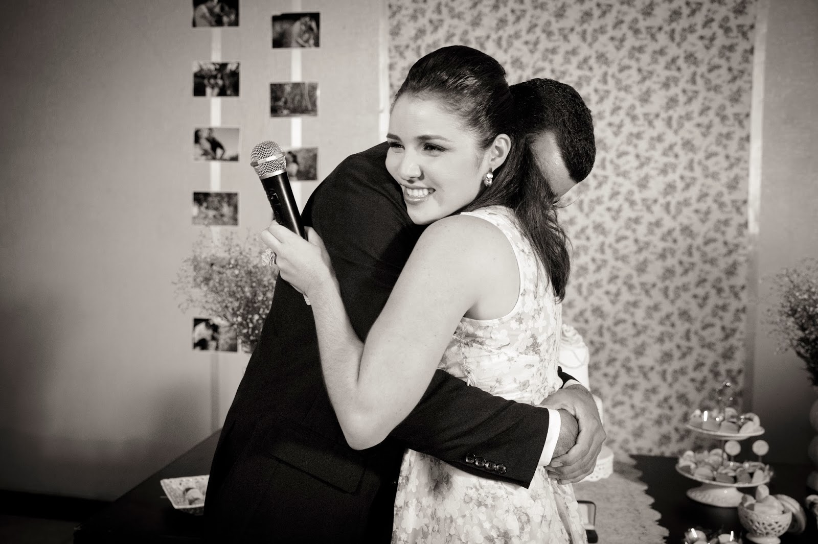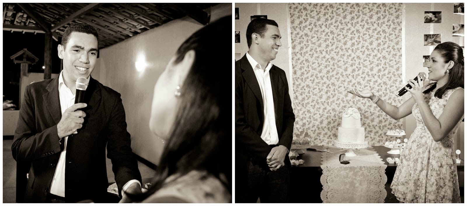 “O pedido de casamento foi uma semana antes do noivado e tem tudo haver conosco. Luan me convidou para sair e fotografar. Pendurou nossas alianças em uma fita de cetim numa árvore, sem que eu percebesse… Depois de algum tempo fotografando, ele me pediu para mirar num suposto pássaro, que na verdade eram nossas alianças. De primeira não consegui perceber, mas quando cheguei mais perto vi as alianças penduradas. Chorei rios de felicidade!!! Noivamos no dia 16 de novembro de 2013. Luan é um fofo e me ajudou a preparar cada detalhe.”