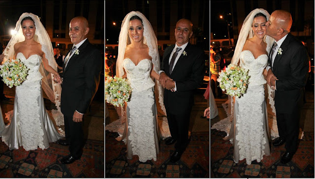 Paola usou um vestido de noiva tomara-que-caia da estilista Lethicia Bronstein, com decote coração, corpete, saia de cetim com detalhes em renda. Tinha um detalhe Peplum na cintura! Lembra que falamos das tendências em vestido e o peplum era uma delas?Como penteado, a noiva elegeu um coque médio coberto por véu estilo mantilha, preso por uma tiara de brilhantes. A maquiagem da noiva trazia olhos bem marcados com esfumado preto e cantos internos dos olhos com iluminador e lábios nude.