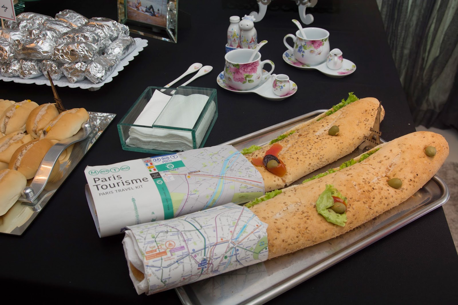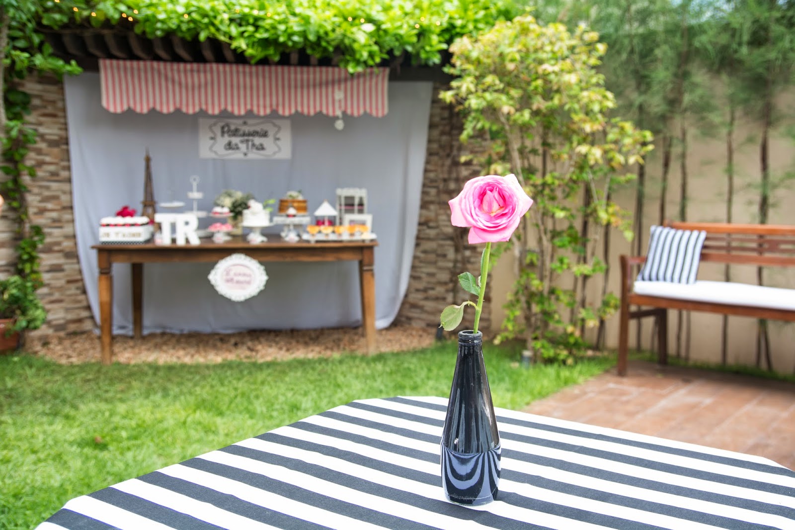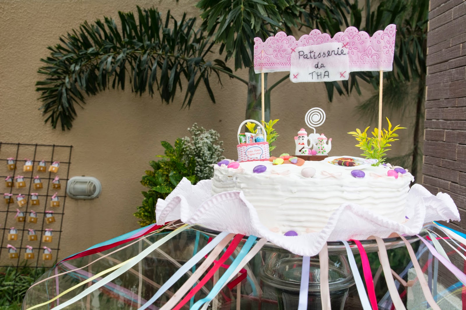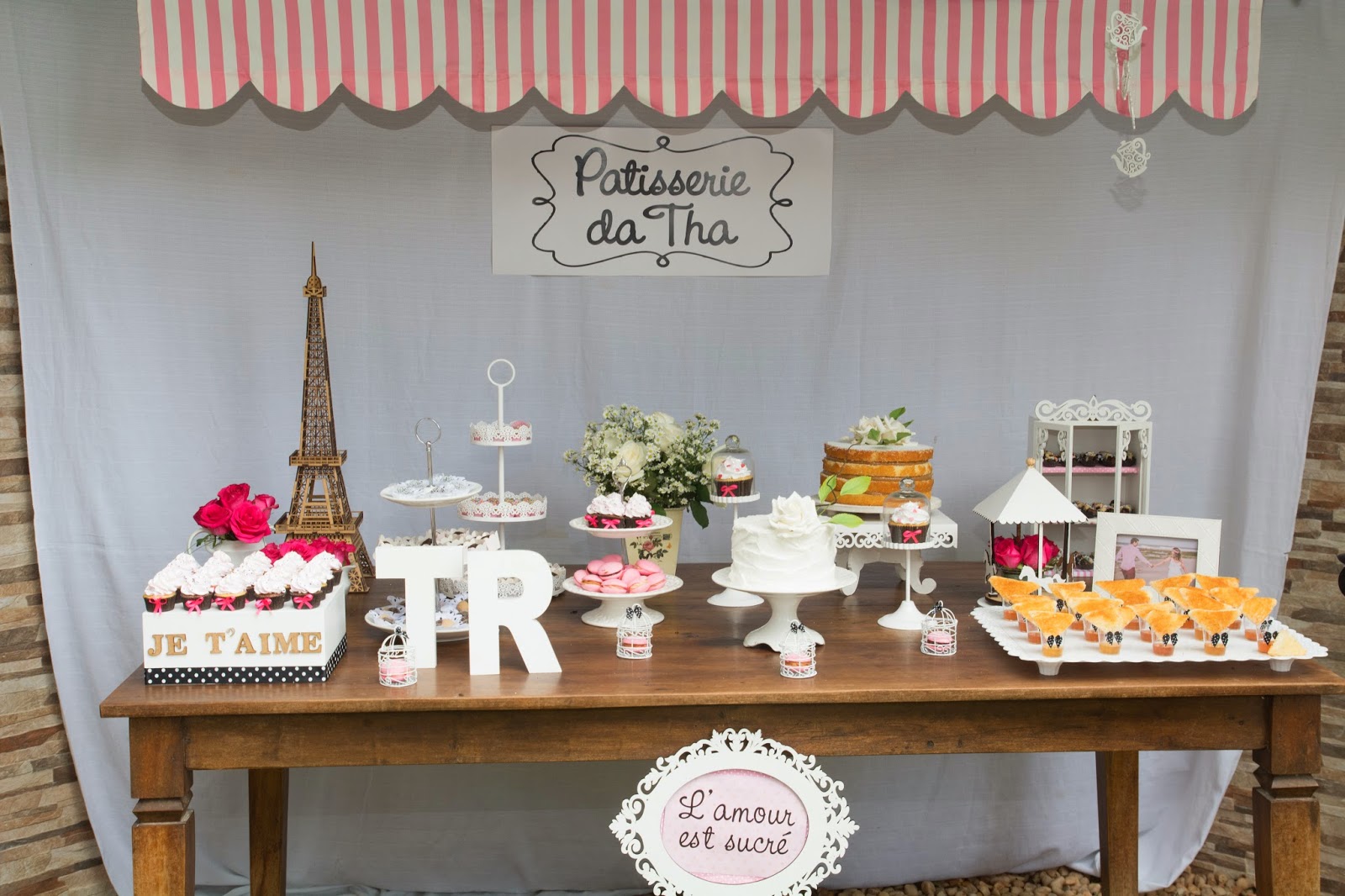 “A ideia do tema do chá, “Patisserie da Tha”, veio do meu amor pelas padarias de Paris que surgiu quando fui estudar na França por um ano. Nunca nem hesitei fazer outro tema! Logo que passei a ideia pra minha mãe, ela adorou e decidimos fazer o chá por “conta própria”, esquema “DIY (do it yourself). Sim, dá BEM MAIS trabalho… (eu não teria conseguido sem a ajuda da minha mãe e de algumas amigas!), mas ao mesmo tempo, a experiência se torna bem mais INTENSA (em todos os sentidos!). Eu não entro nem no mérito se parte financeira. Não colocamos na ponta do lápis para saber se realmente compensa ou não… O fato é que isso é algo que GOSTAMOS de fazer, tínhamos disponibilidade para e a gente já queria montar um “mini-acervo” para nossas festinhas, já que desde o meu noivado, estamos adorando isso de organizar essas coisas, pensar numa paleta. coletar inspirações e colocar em prática!