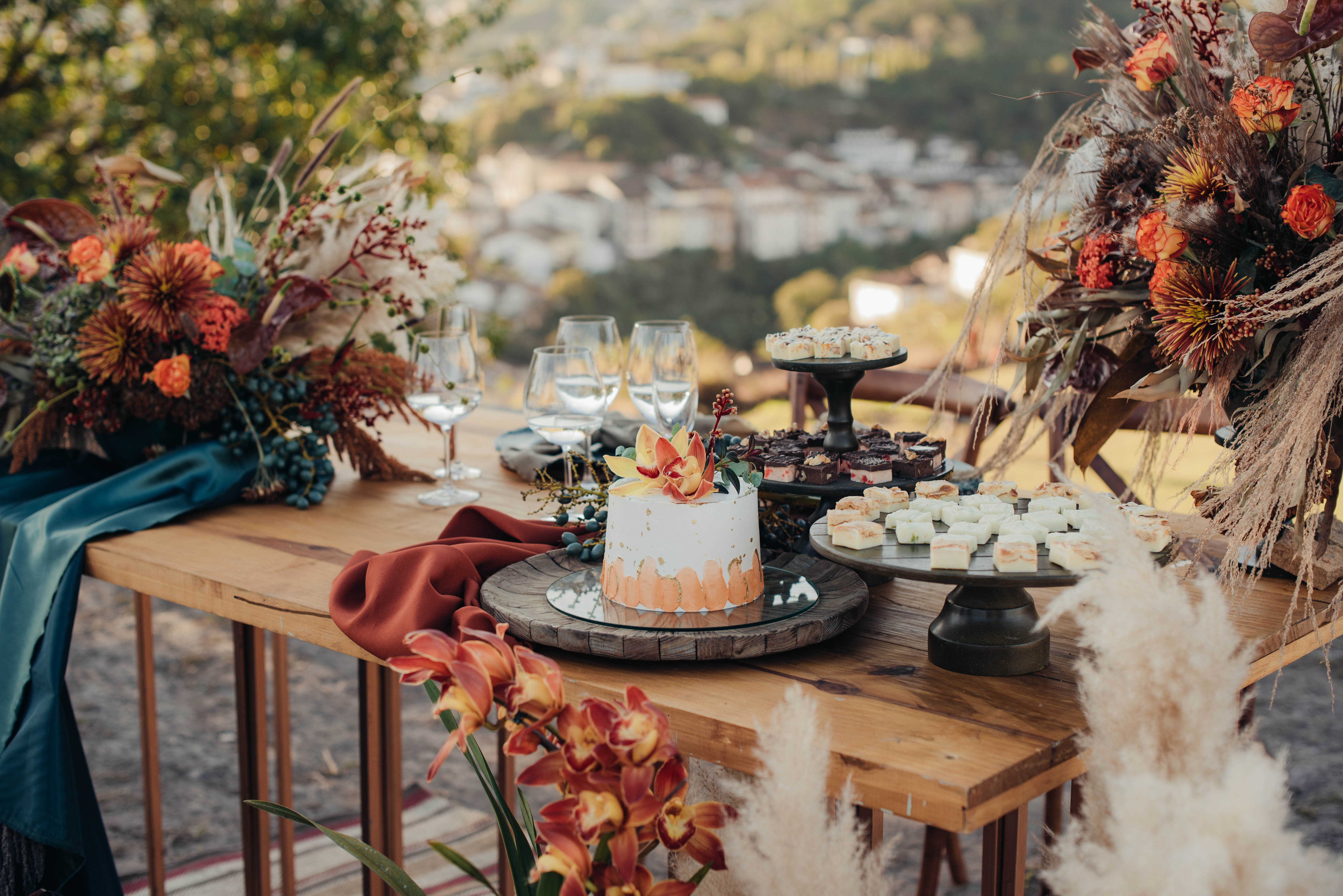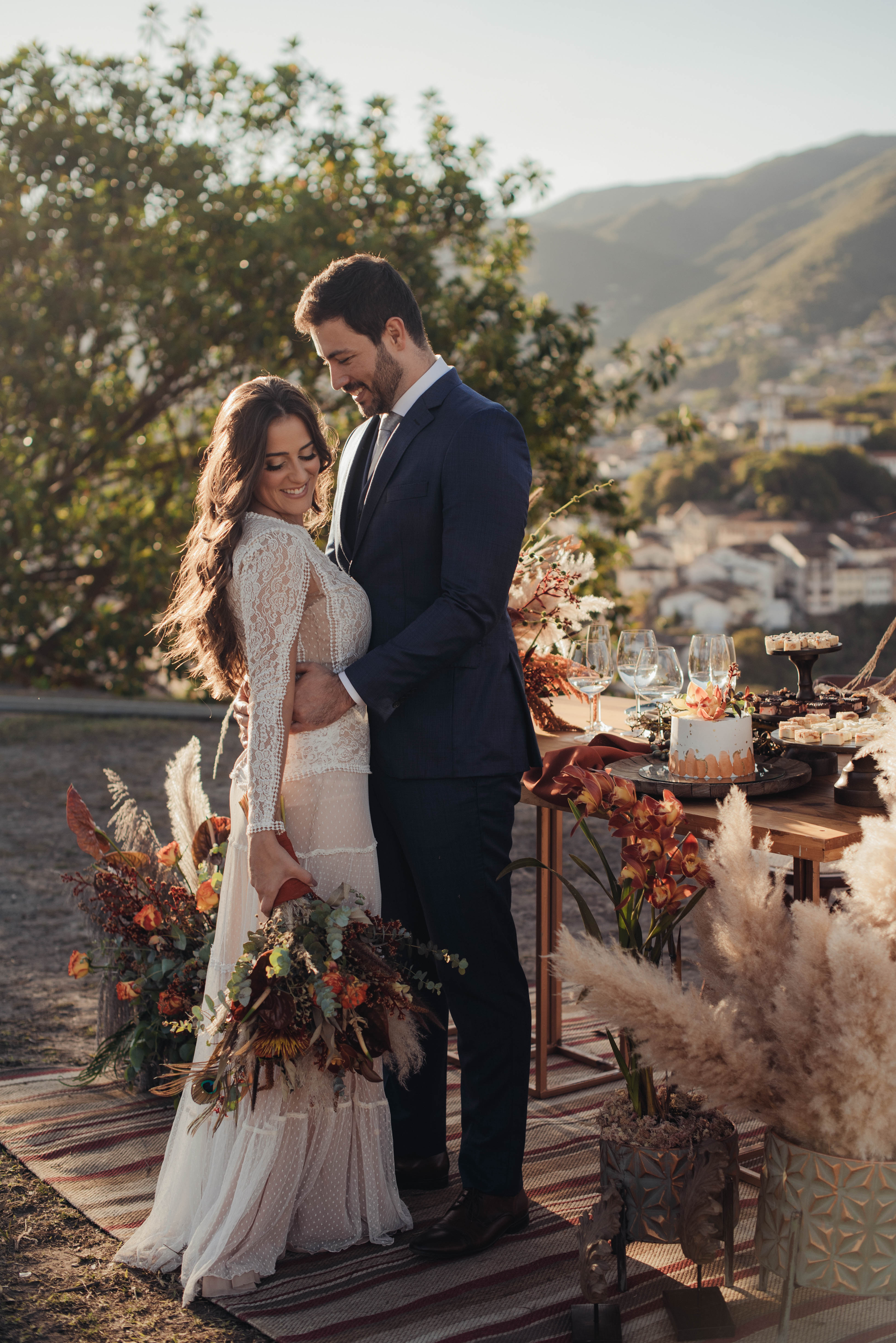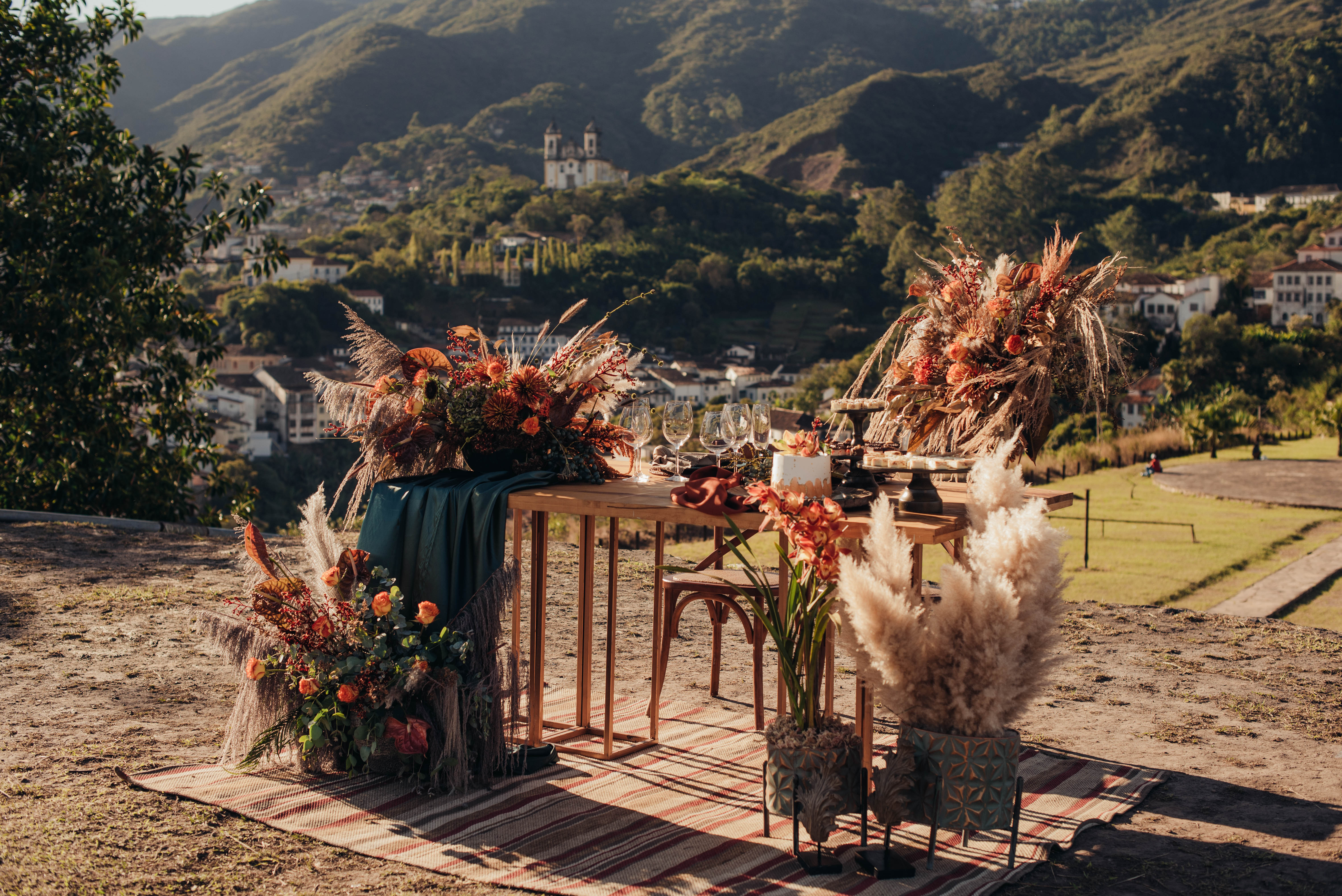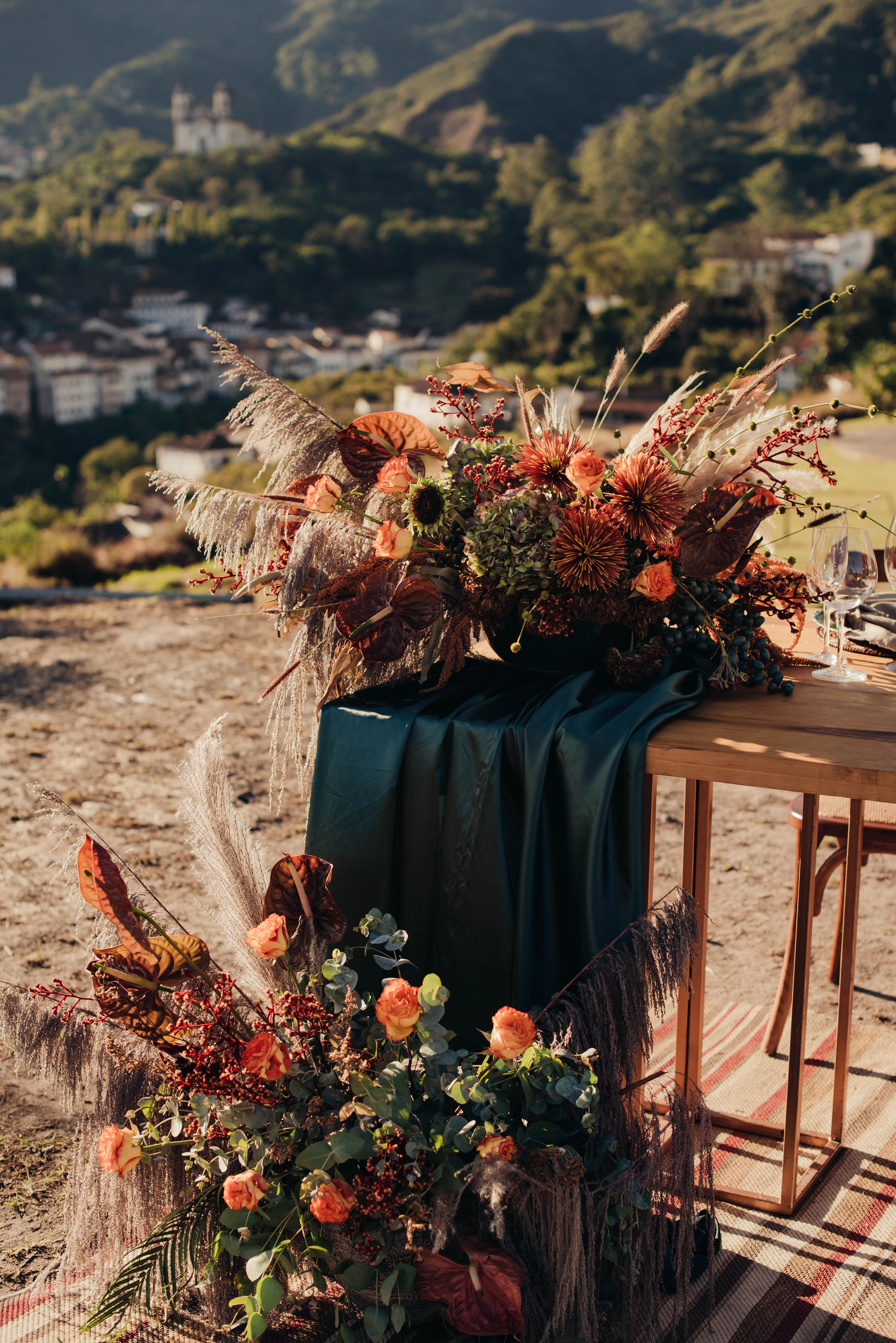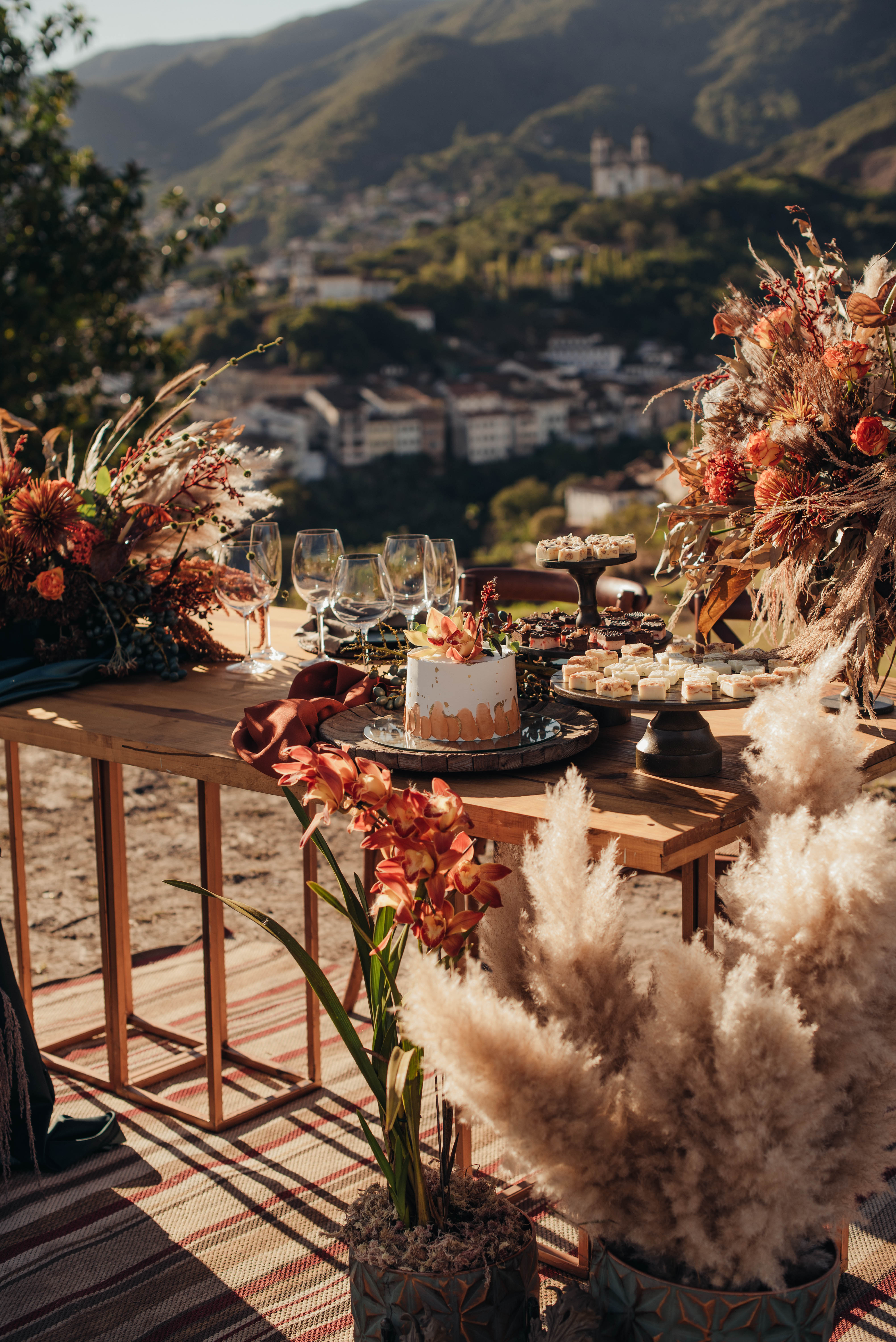O Gil e o Alexandre (Purpurata Flor e Decor) aproveitaram as cores desse cenário e desenvolveram um projeto lindo em tons de terracota. O backdrop da cerimônia teve tons mais neutros que, combinado à mistura de texturas, só valorizou a paisagem de Ouro Preto e os tons do inverno. Para a mesa posta, os meninos usaram as cores quentes em contraste com um pouco de verde, que valorizou o bolo da Renata Tropia e os doces da Rara Bala Delícia.