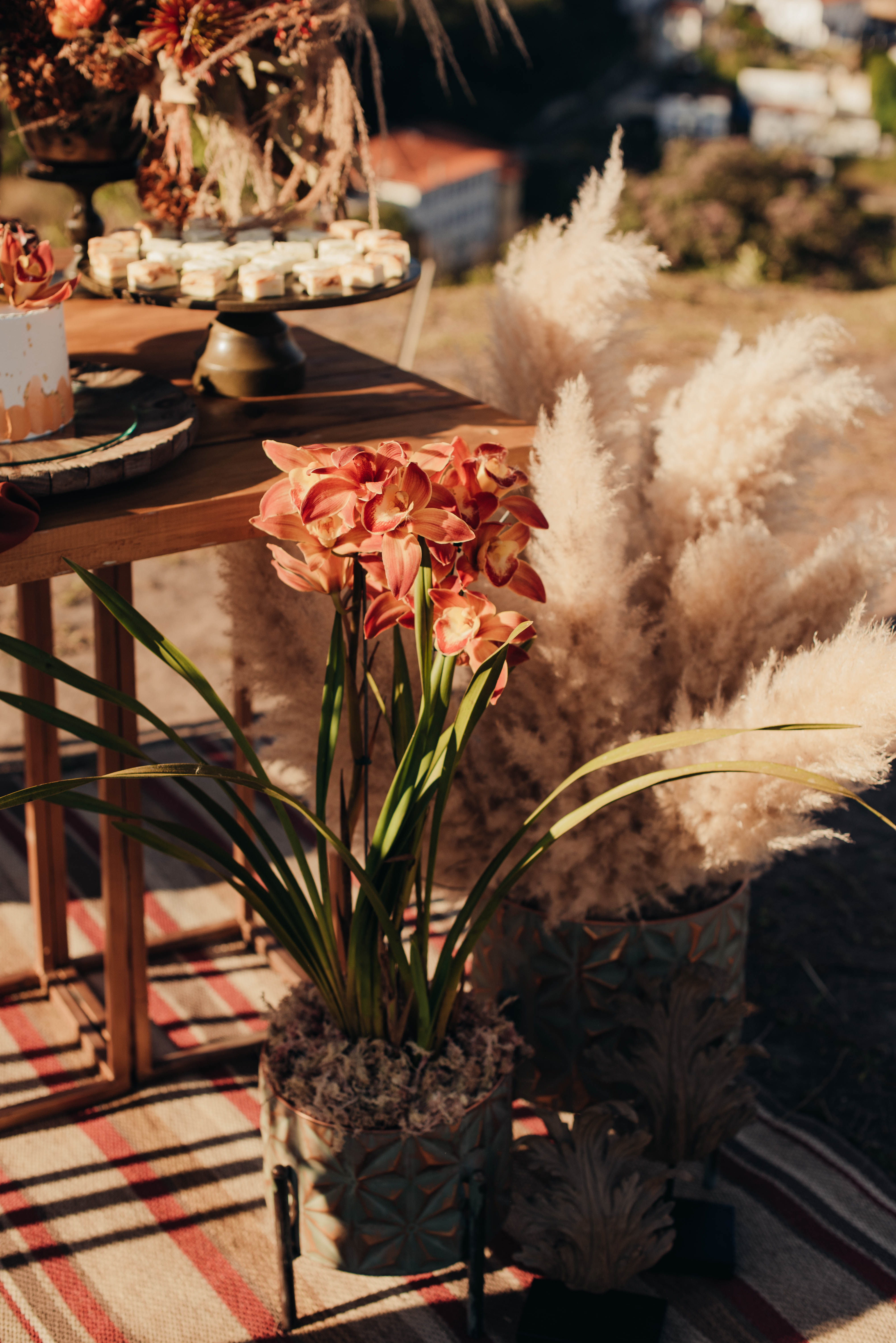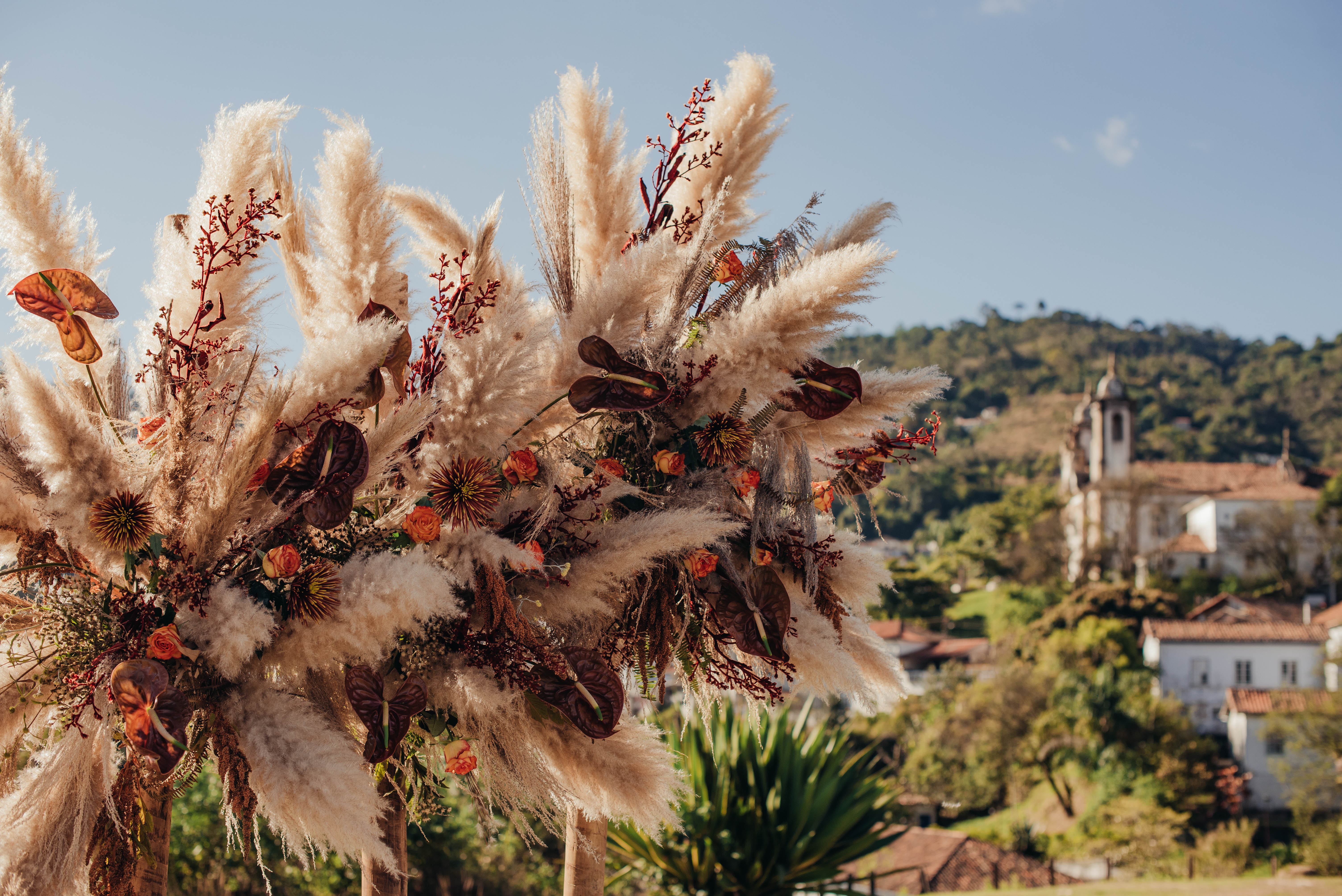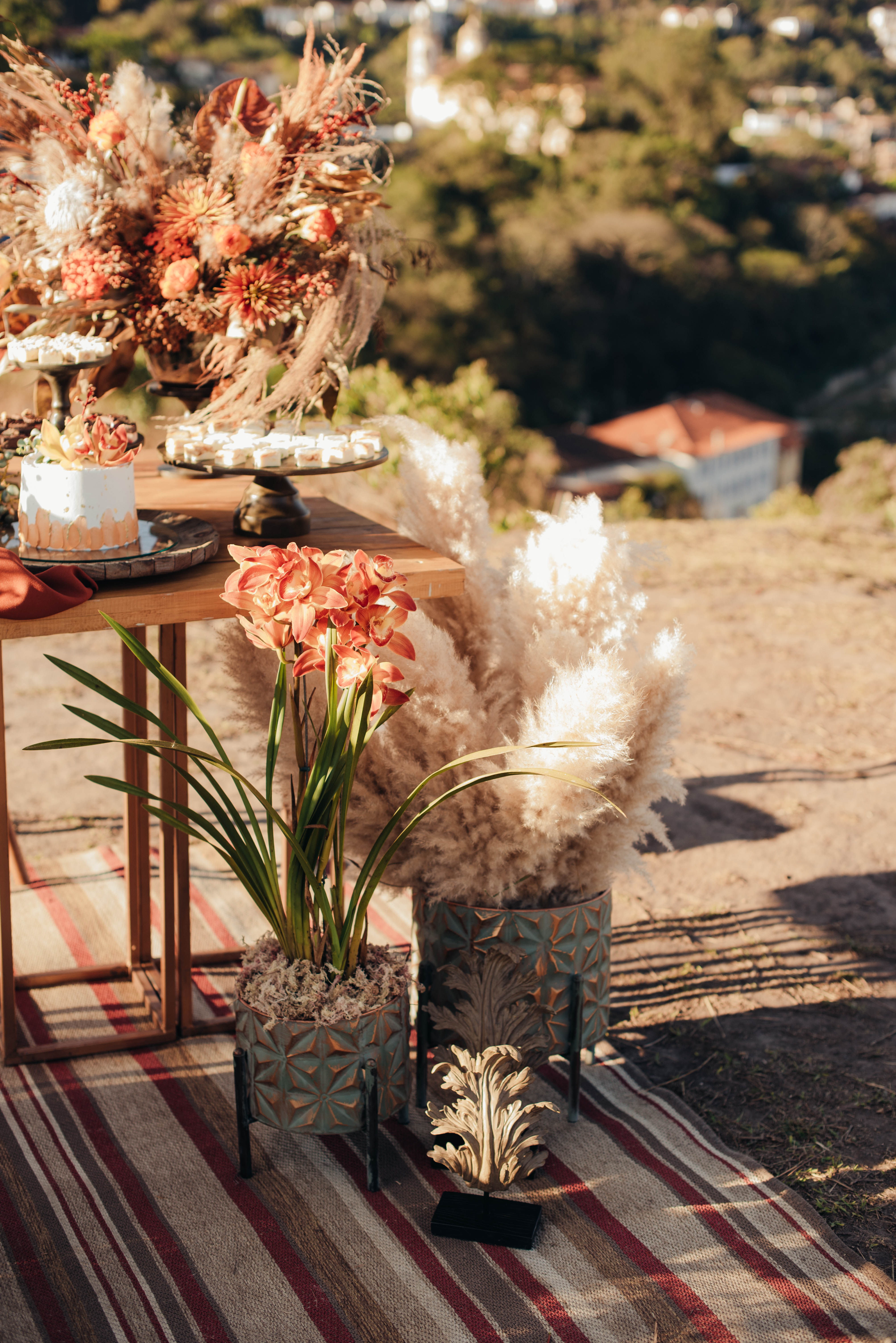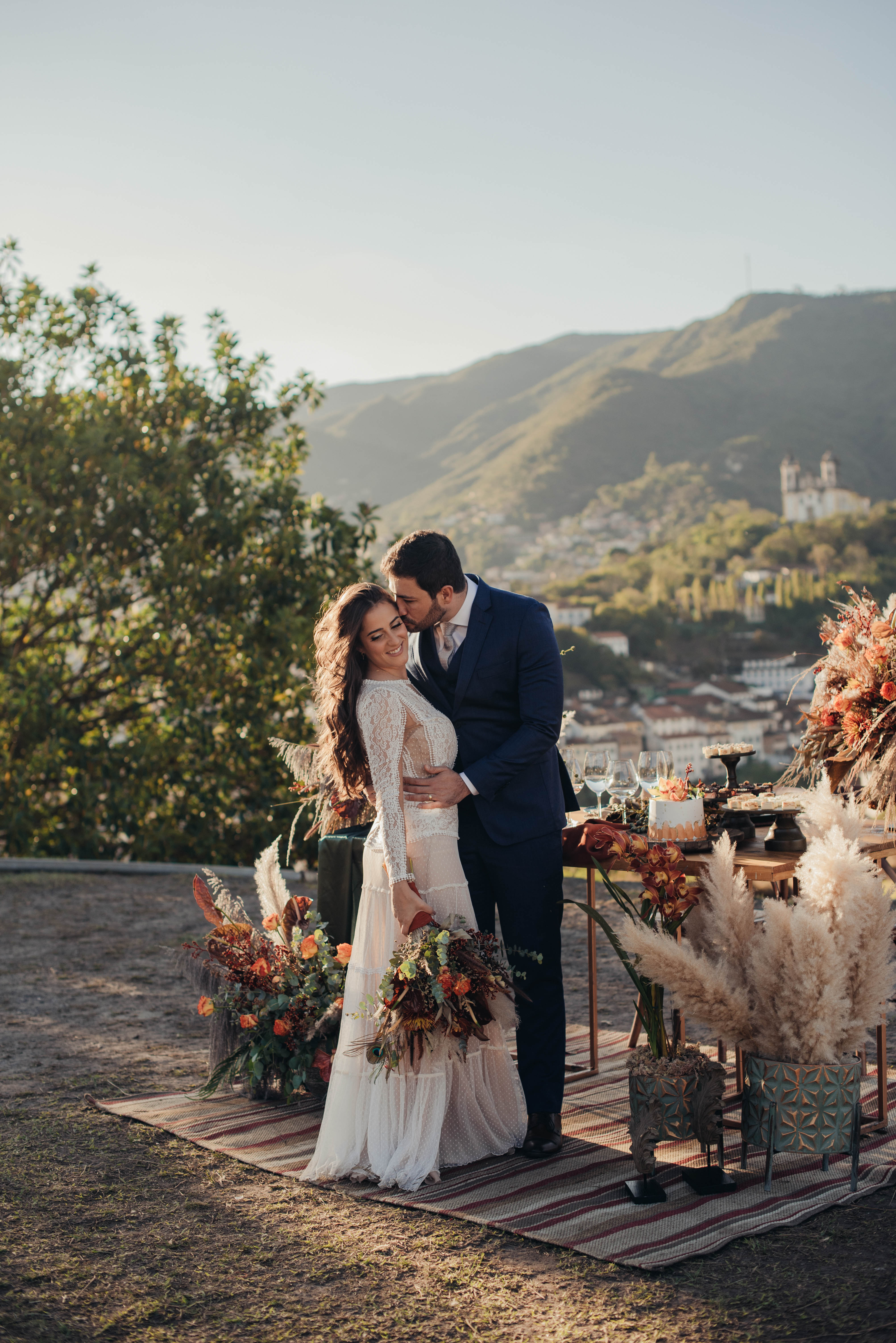 O Gil e o Alexandre (Purpurata Flor e Decor) aproveitaram as cores desse cenário e desenvolveram um projeto lindo em tons de terracota. O backdrop da cerimônia teve tons mais neutros que, combinado à mistura de texturas, só valorizou a paisagem de Ouro Preto e os tons do inverno. Para a mesa posta, os meninos usaram as cores quentes em contraste com um pouco de verde, que valorizou o bolo da Renata Tropia e os doces da Rara Bala Delícia.