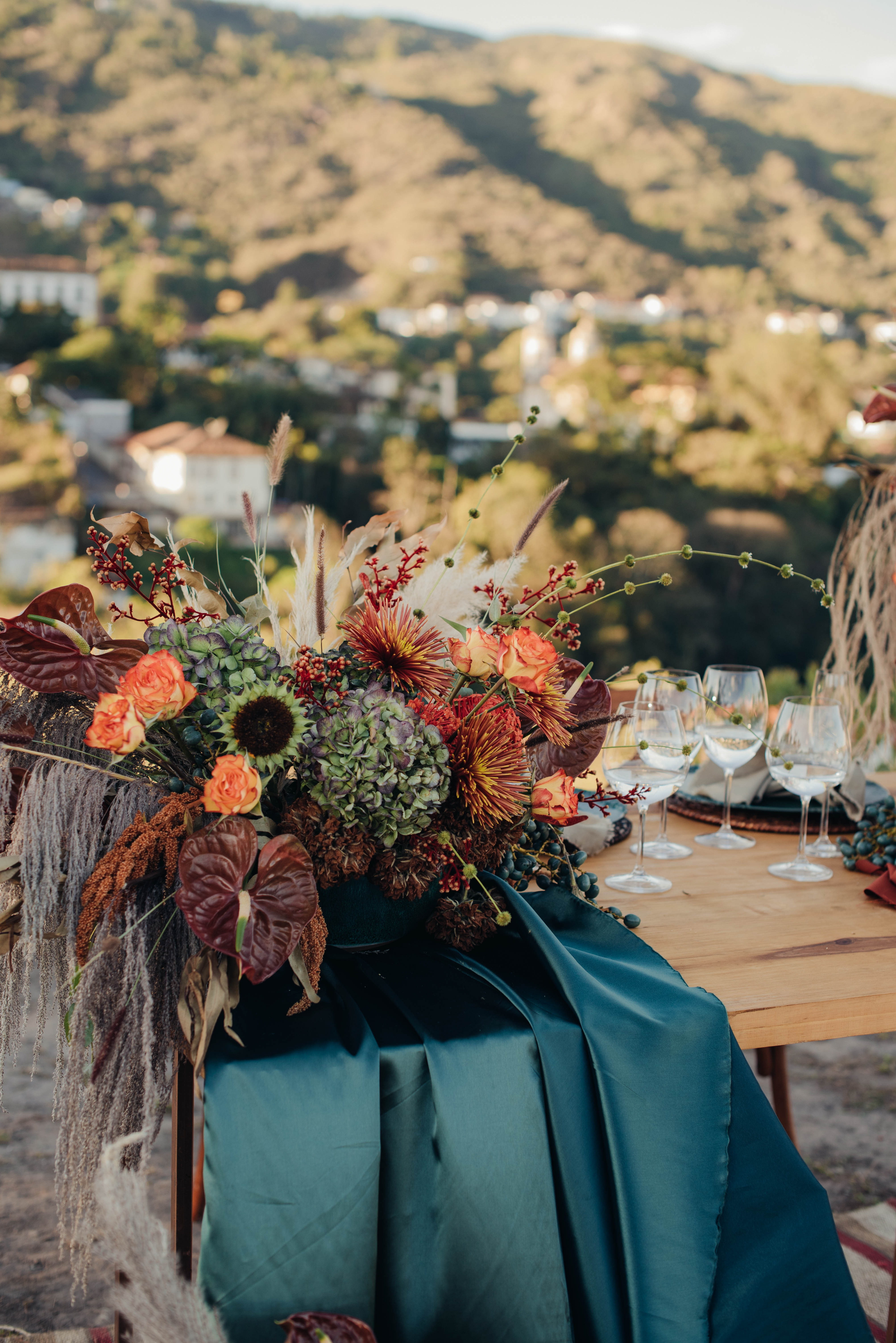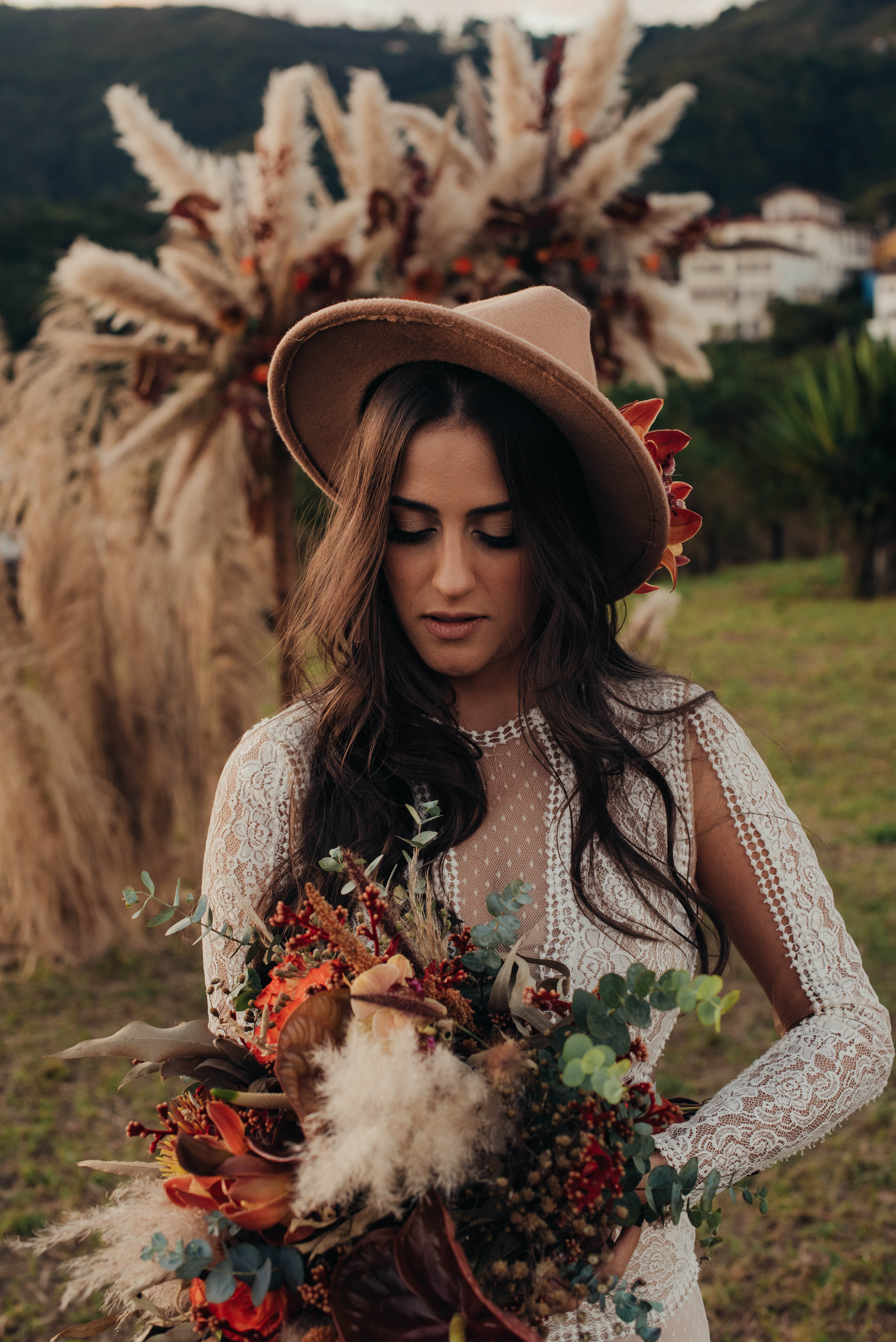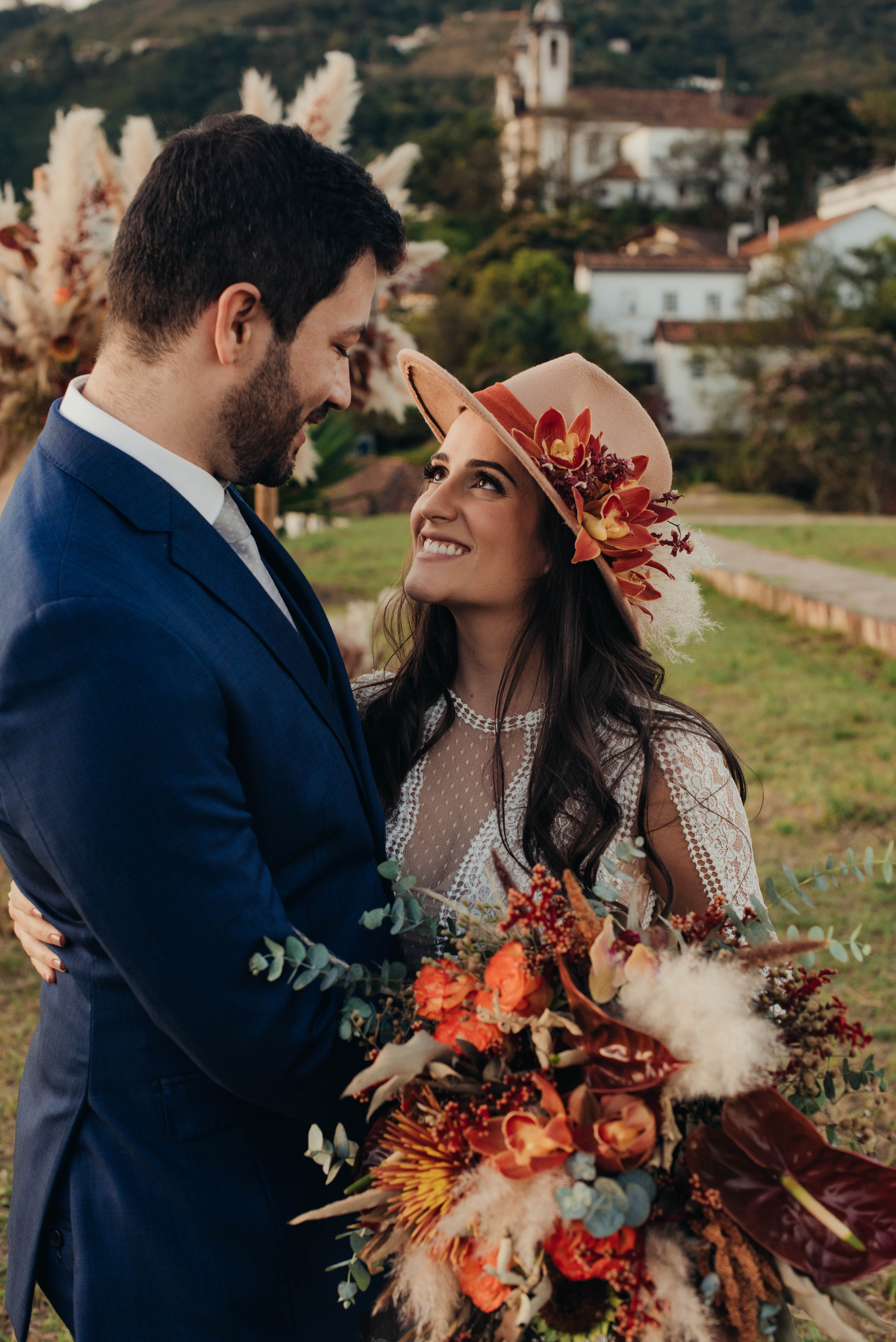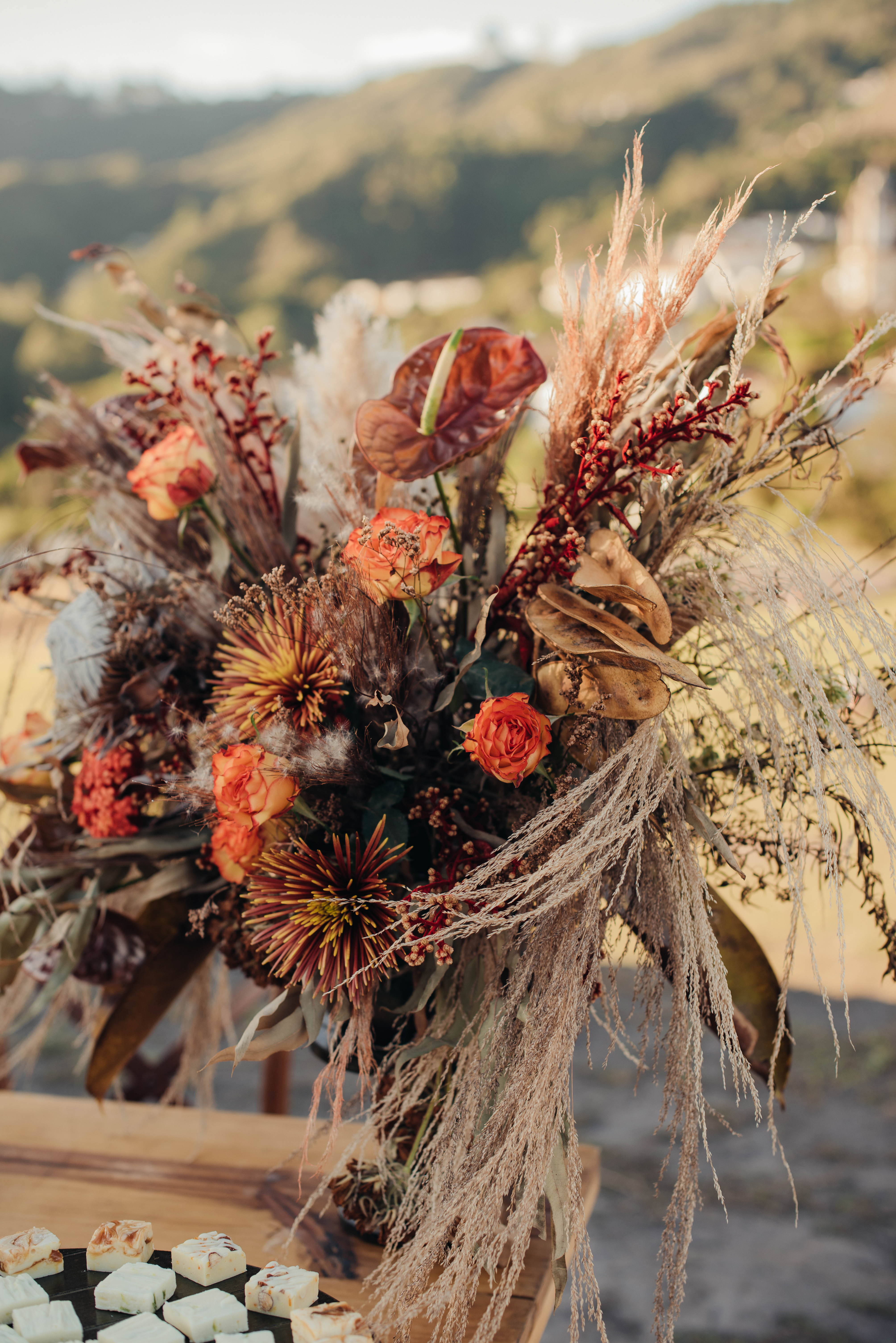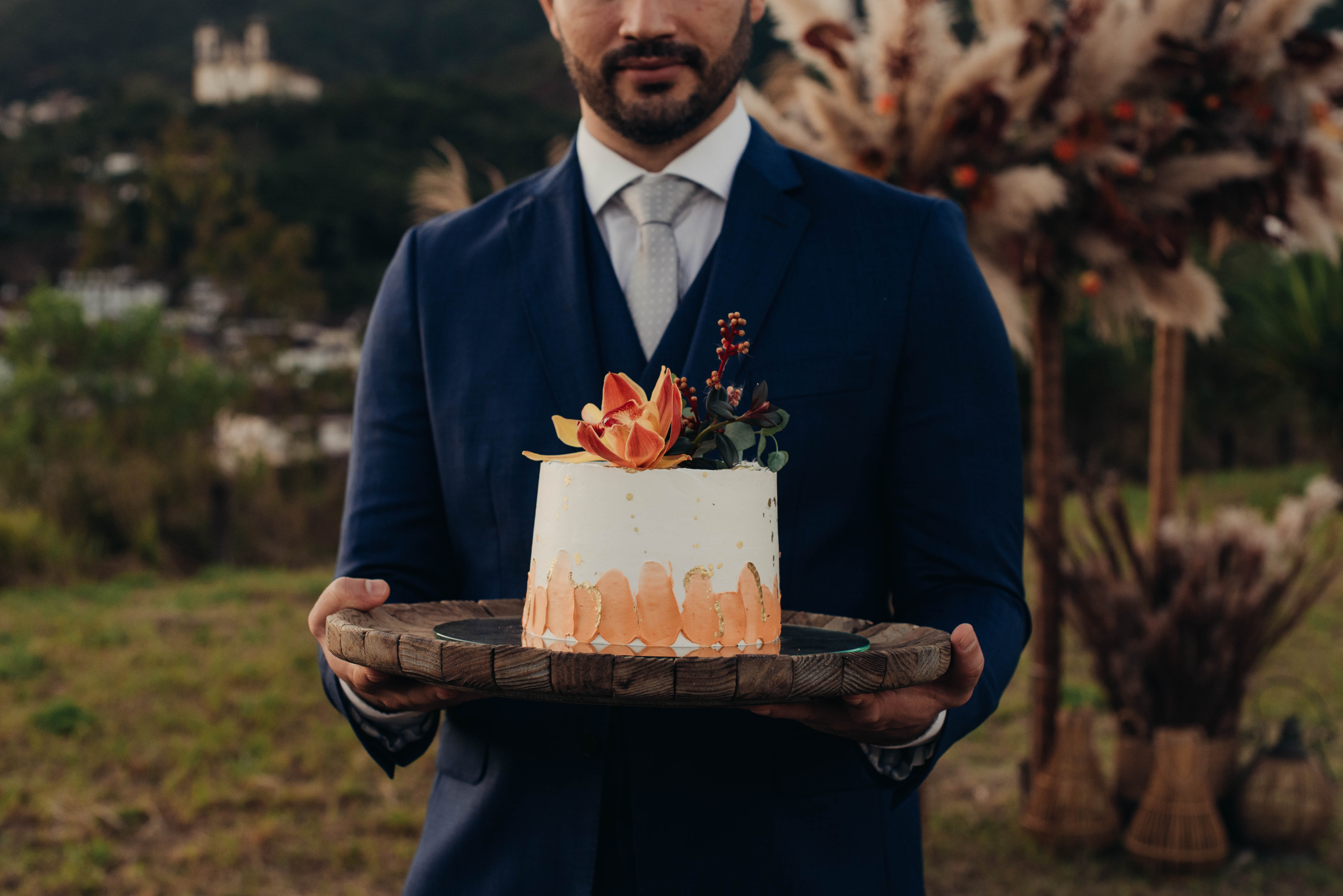 O Gil e o Alexandre (Purpurata Flor e Decor) aproveitaram as cores desse cenário e desenvolveram um projeto lindo em tons de terracota. O backdrop da cerimônia teve tons mais neutros que, combinado à mistura de texturas, só valorizou a paisagem de Ouro Preto e os tons do inverno. Para a mesa posta, os meninos usaram as cores quentes em contraste com um pouco de verde, que valorizou o bolo da Renata Tropia e os doces da Rara Bala Delícia.