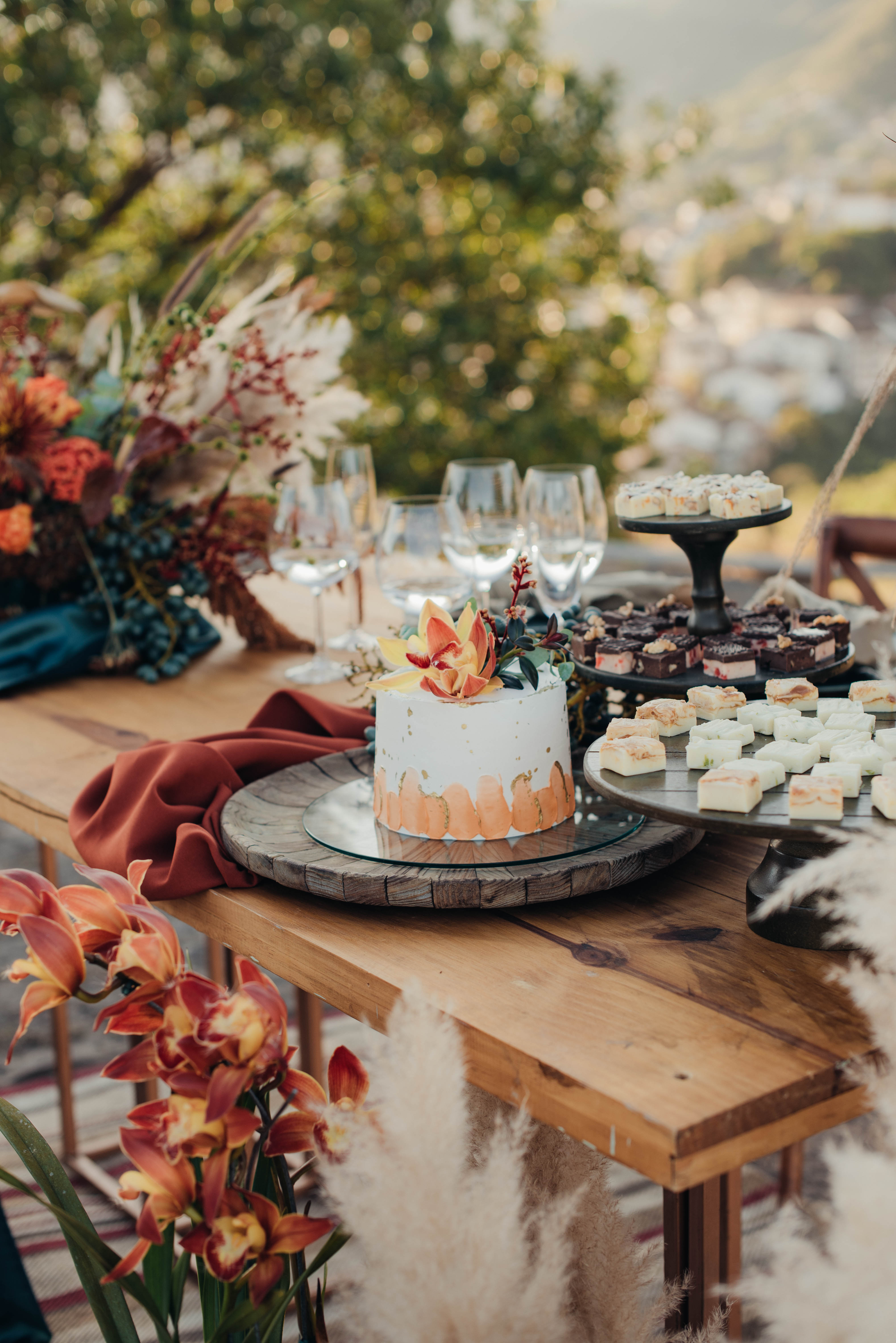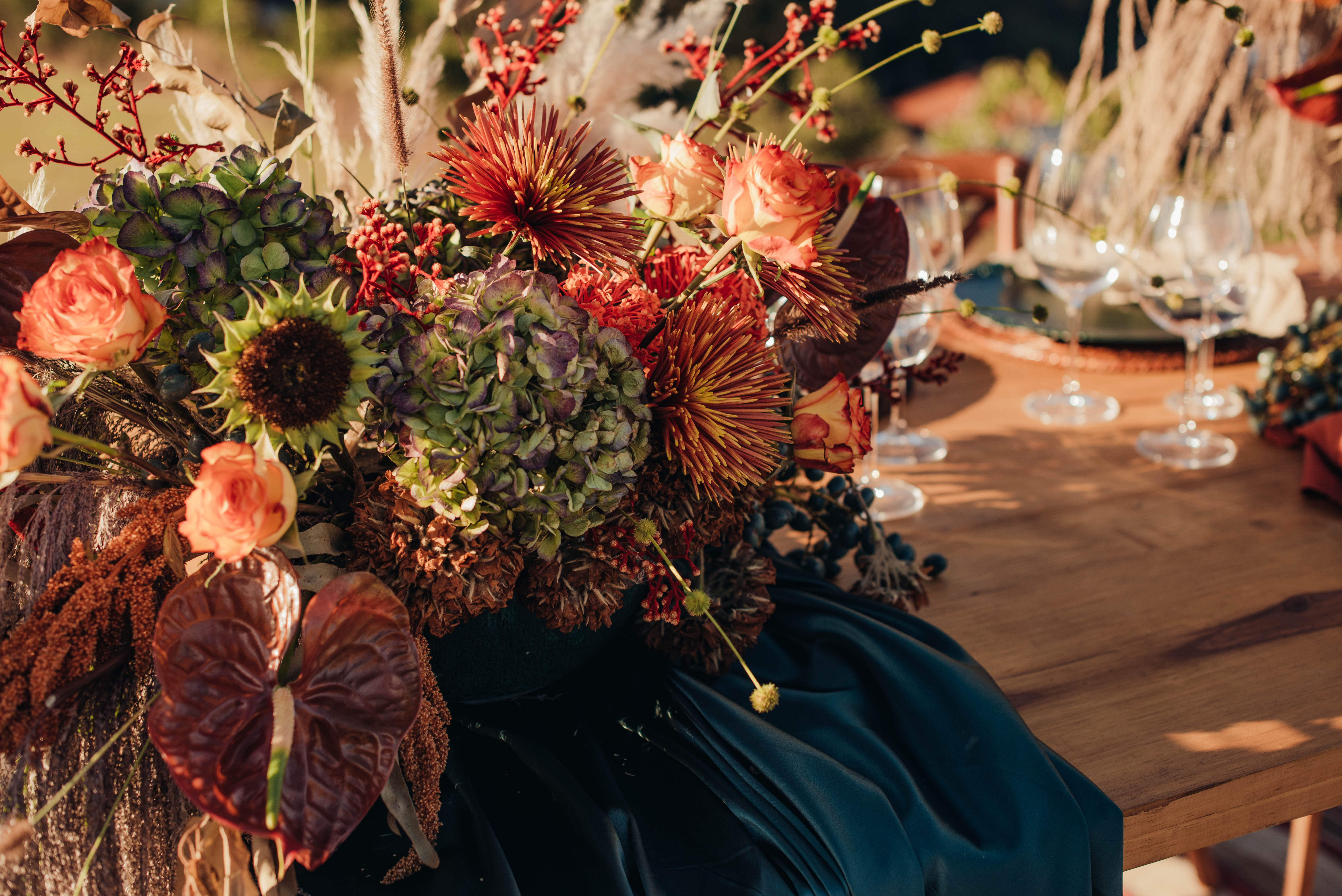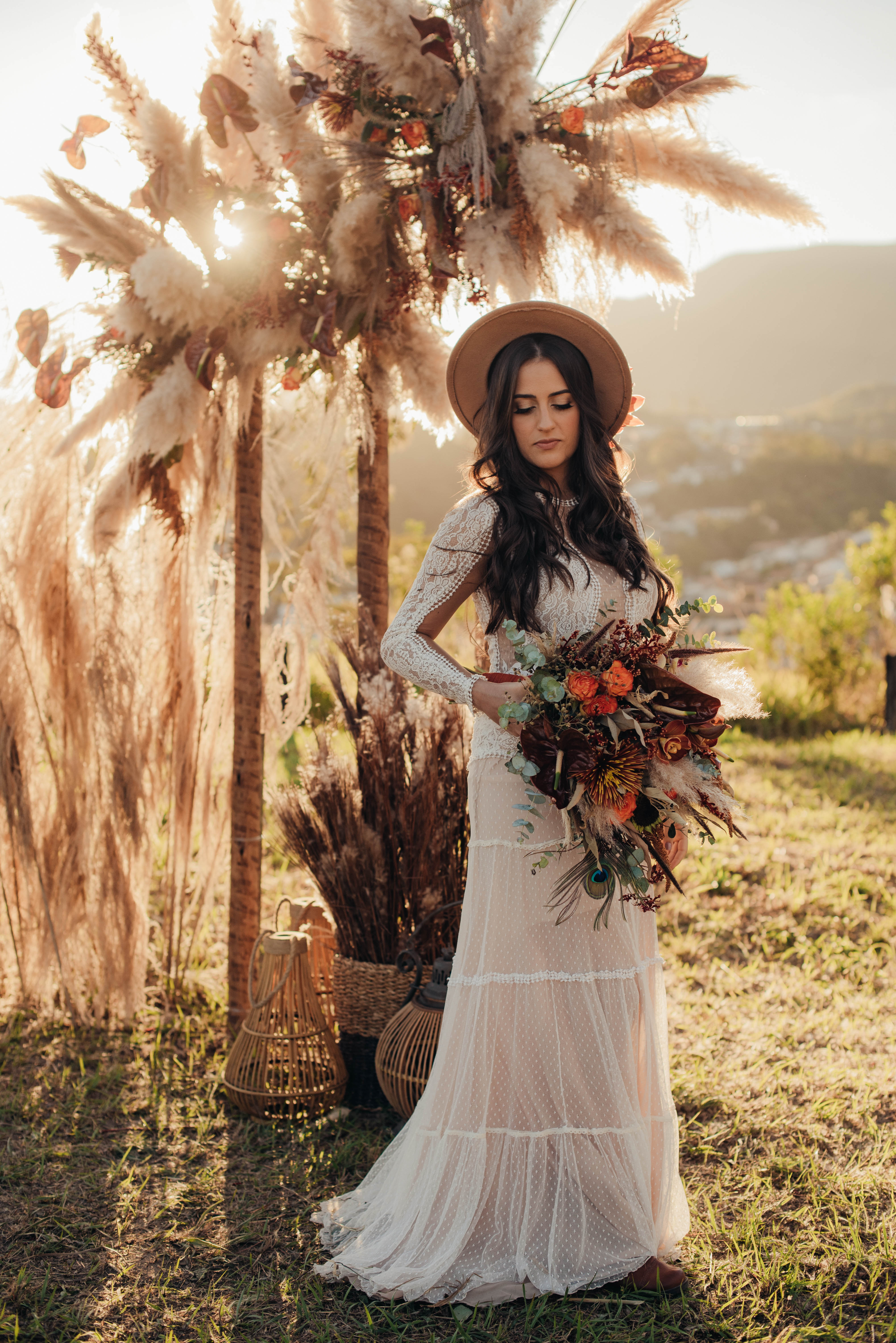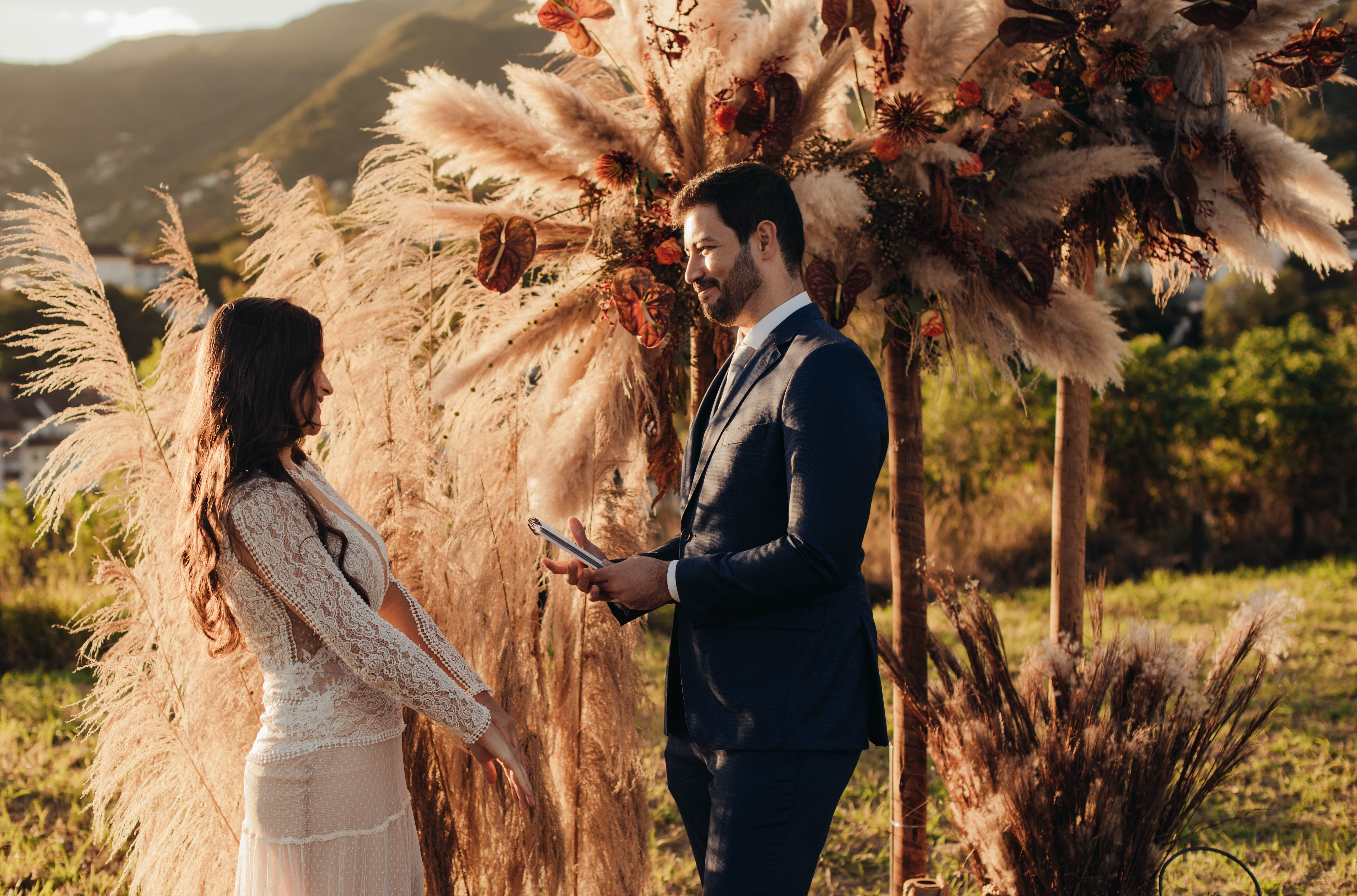 O Gil e o Alexandre (Purpurata Flor e Decor) aproveitaram as cores desse cenário e desenvolveram um projeto lindo em tons de terracota. O backdrop da cerimônia teve tons mais neutros que, combinado à mistura de texturas, só valorizou a paisagem de Ouro Preto e os tons do inverno. Para a mesa posta, os meninos usaram as cores quentes em contraste com um pouco de verde, que valorizou o bolo da Renata Tropia e os doces da Rara Bala Delícia.