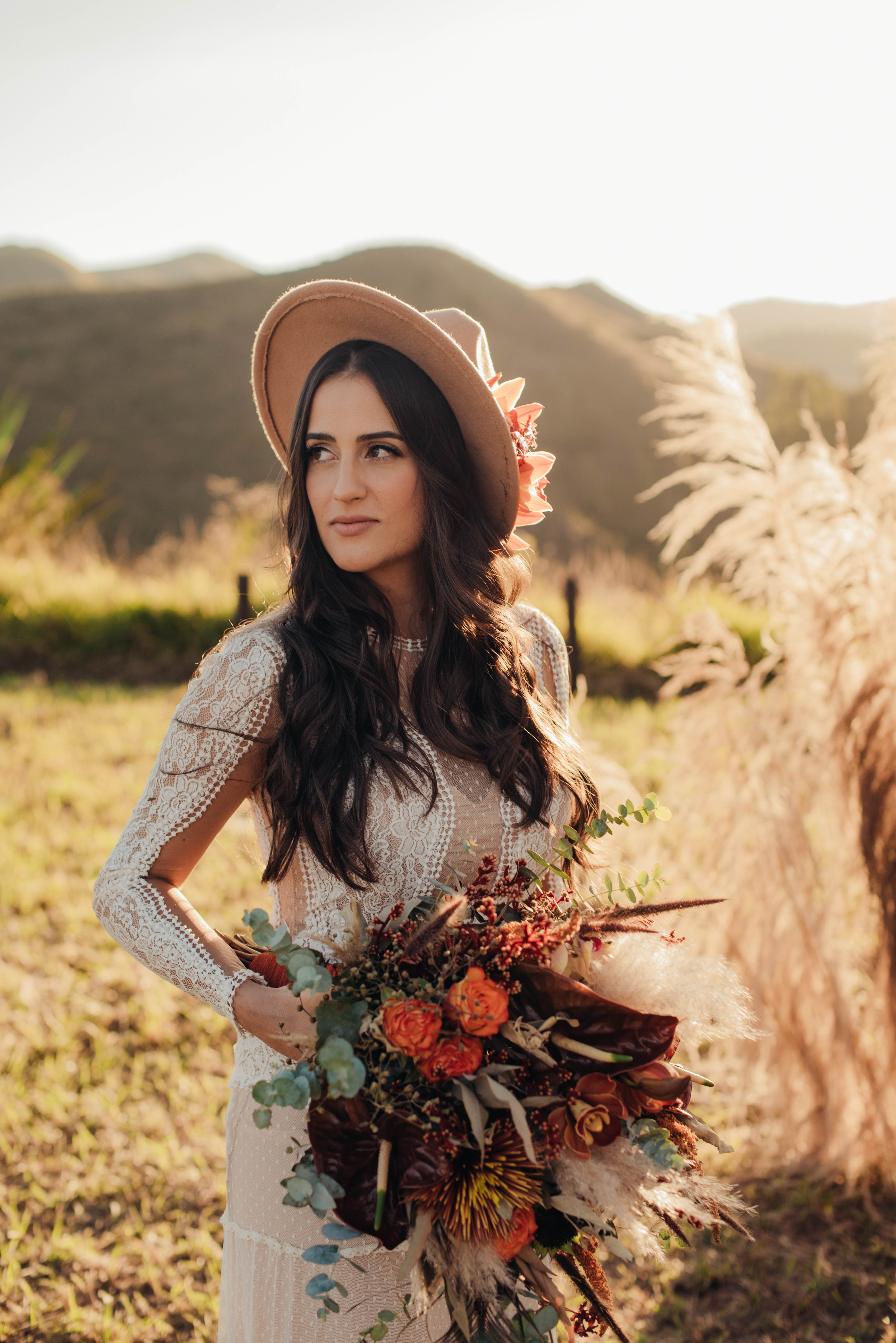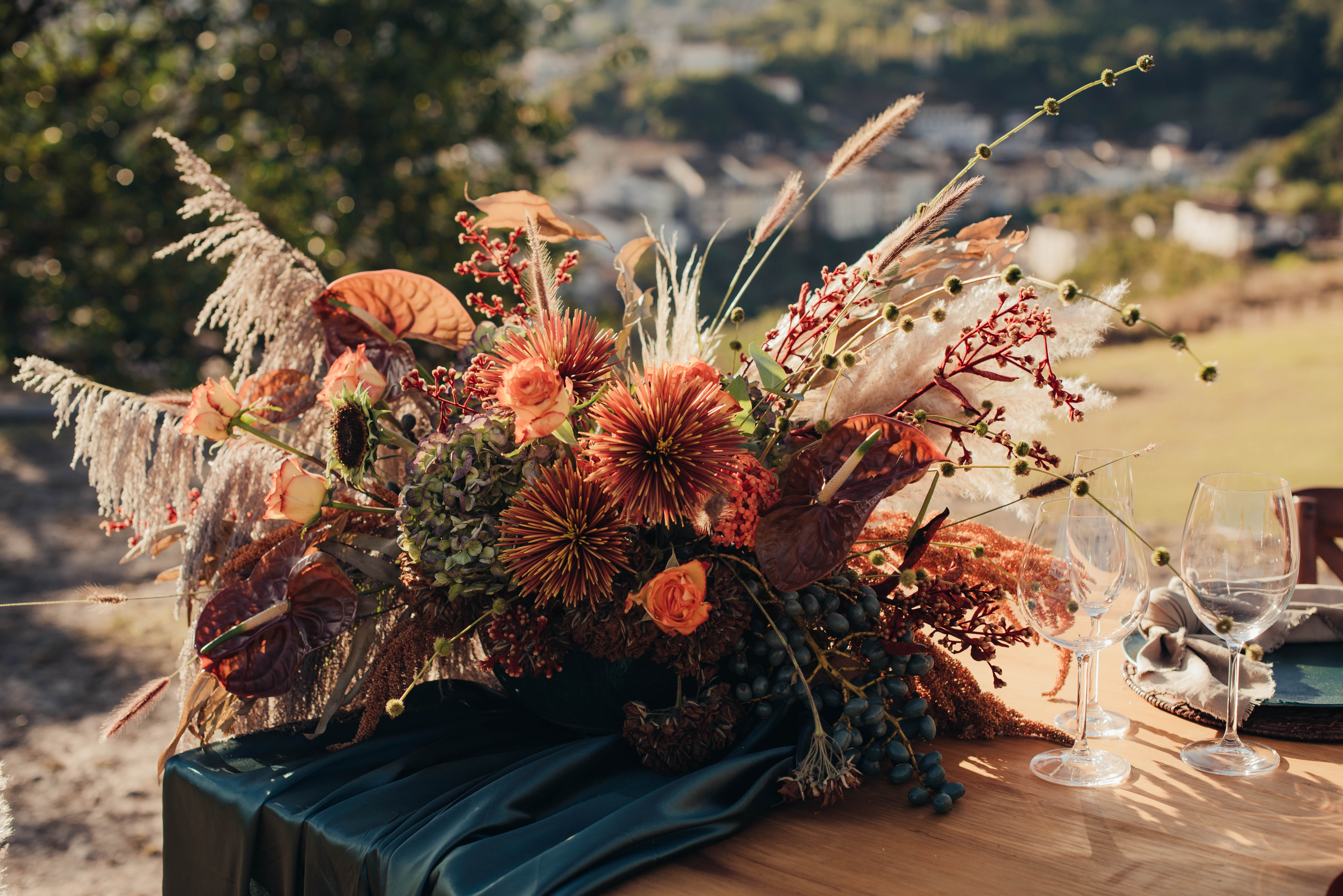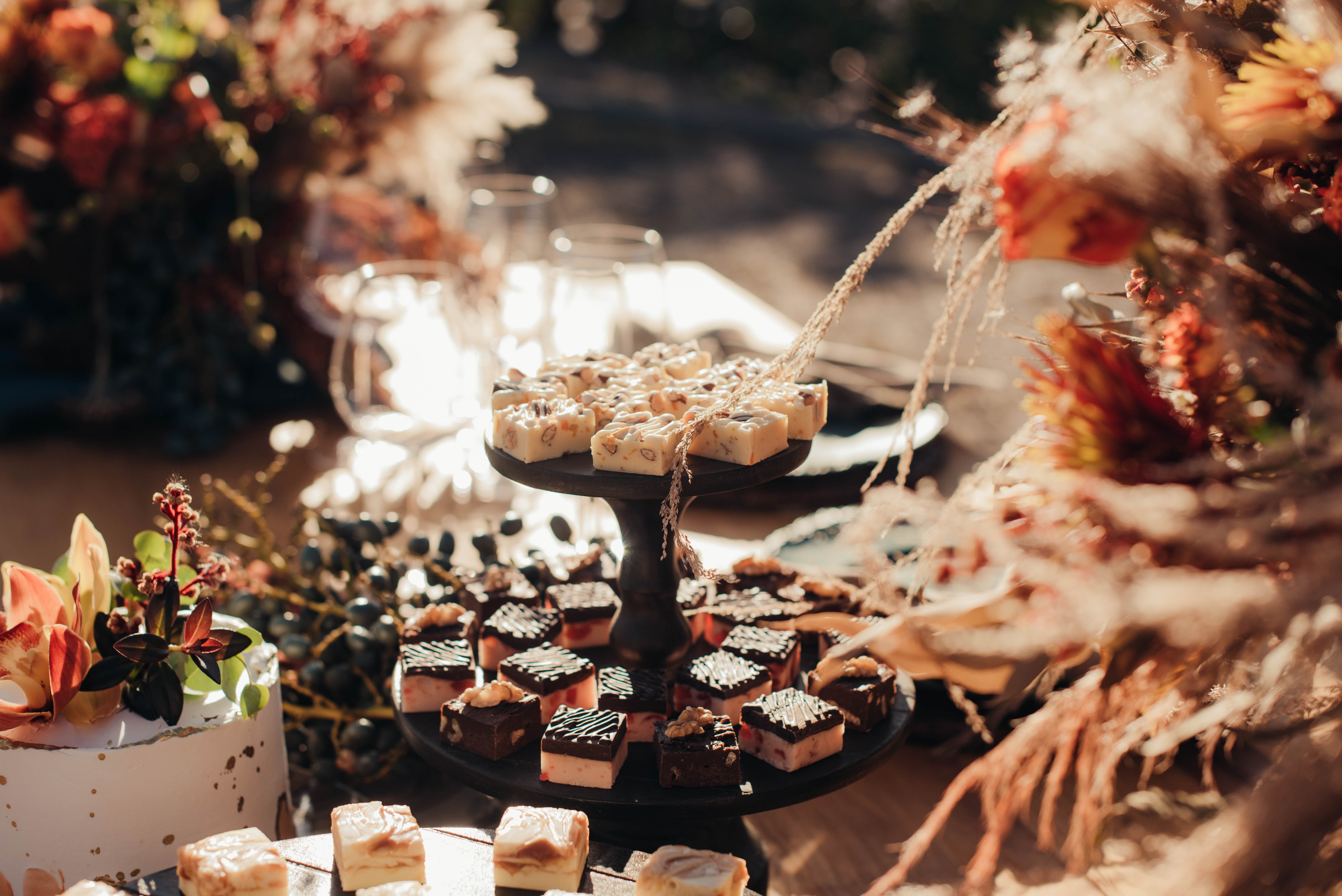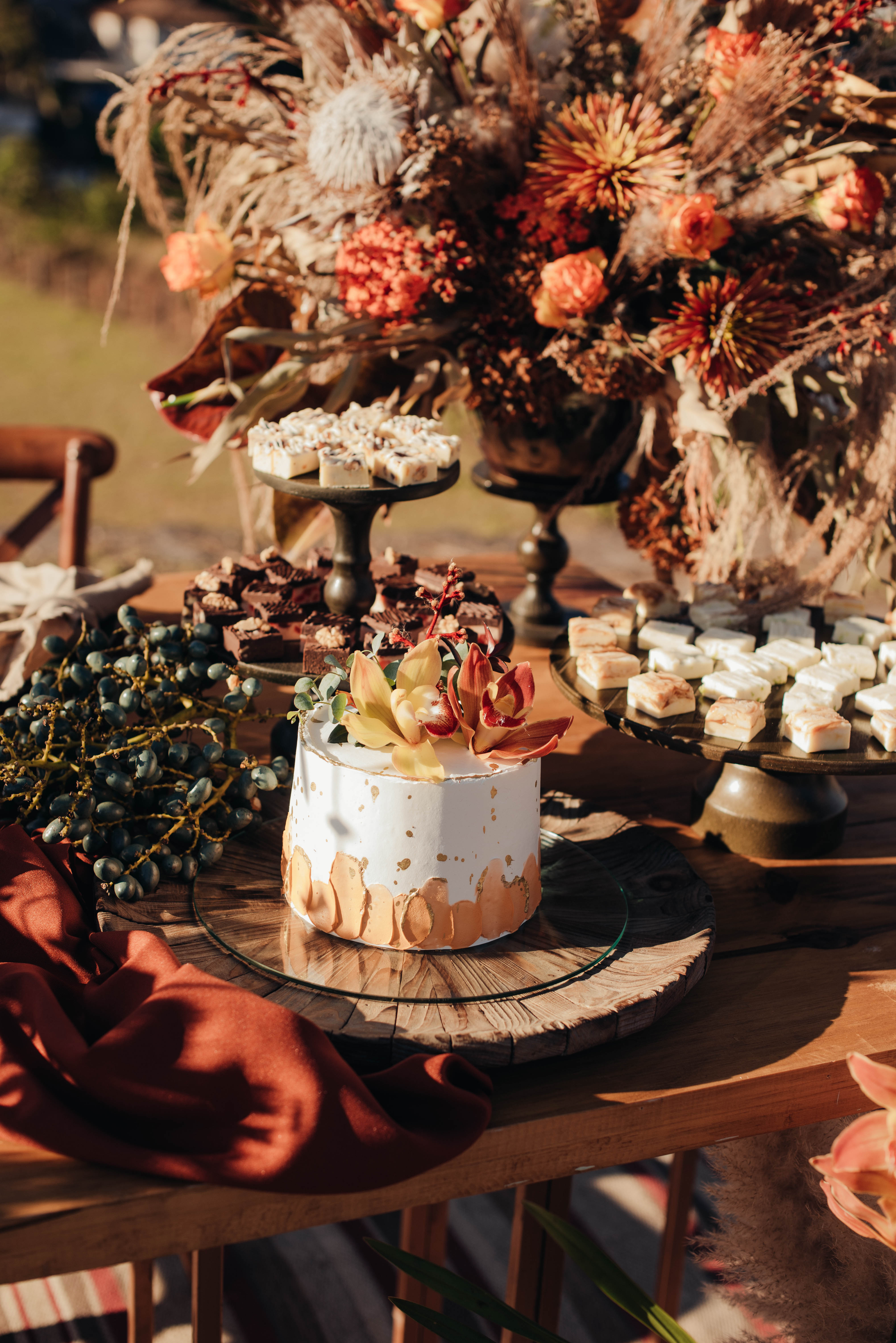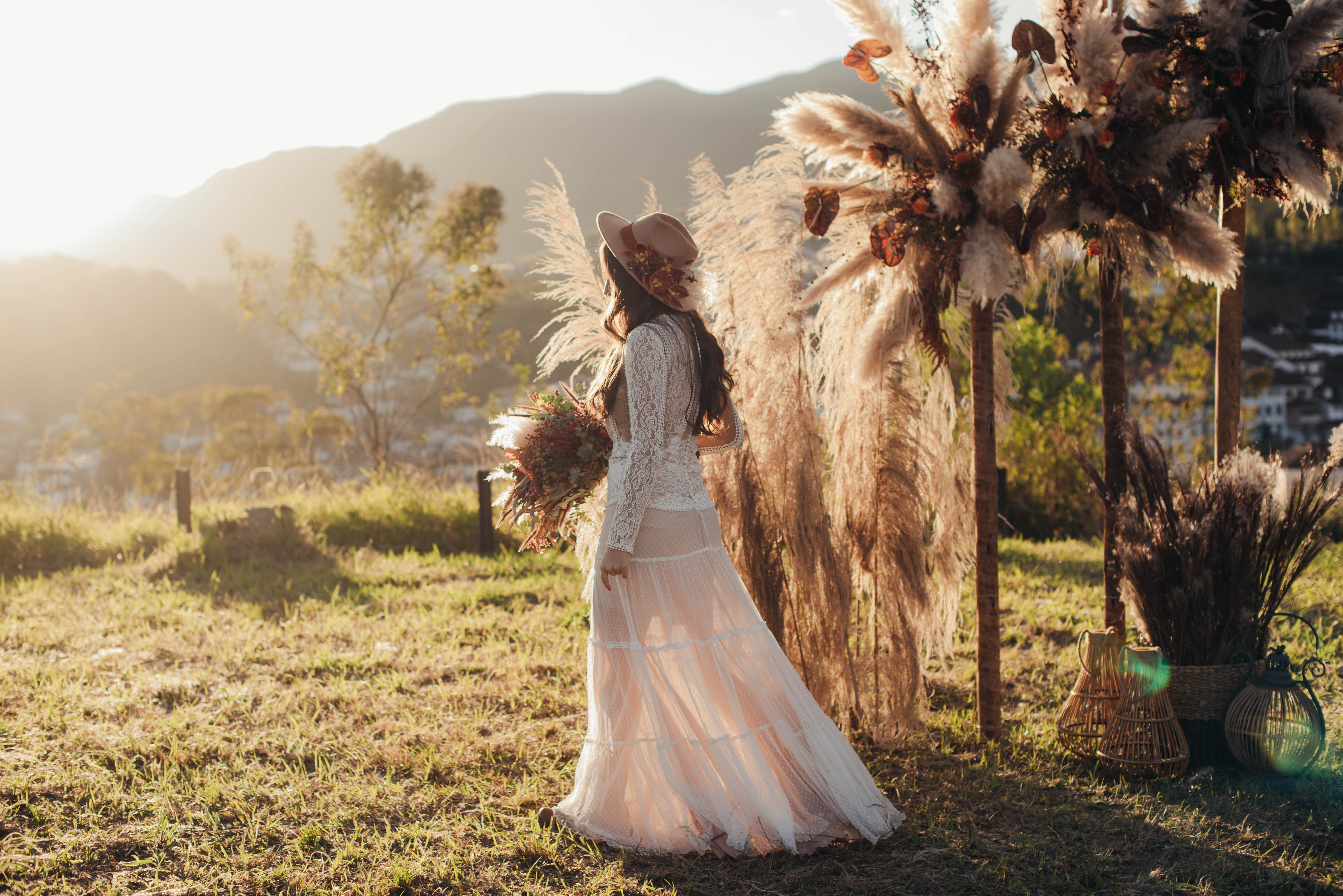 O Gil e o Alexandre (Purpurata Flor e Decor) aproveitaram as cores desse cenário e desenvolveram um projeto lindo em tons de terracota. O backdrop da cerimônia teve tons mais neutros que, combinado à mistura de texturas, só valorizou a paisagem de Ouro Preto e os tons do inverno. Para a mesa posta, os meninos usaram as cores quentes em contraste com um pouco de verde, que valorizou o bolo da Renata Tropia e os doces da Rara Bala Delícia.