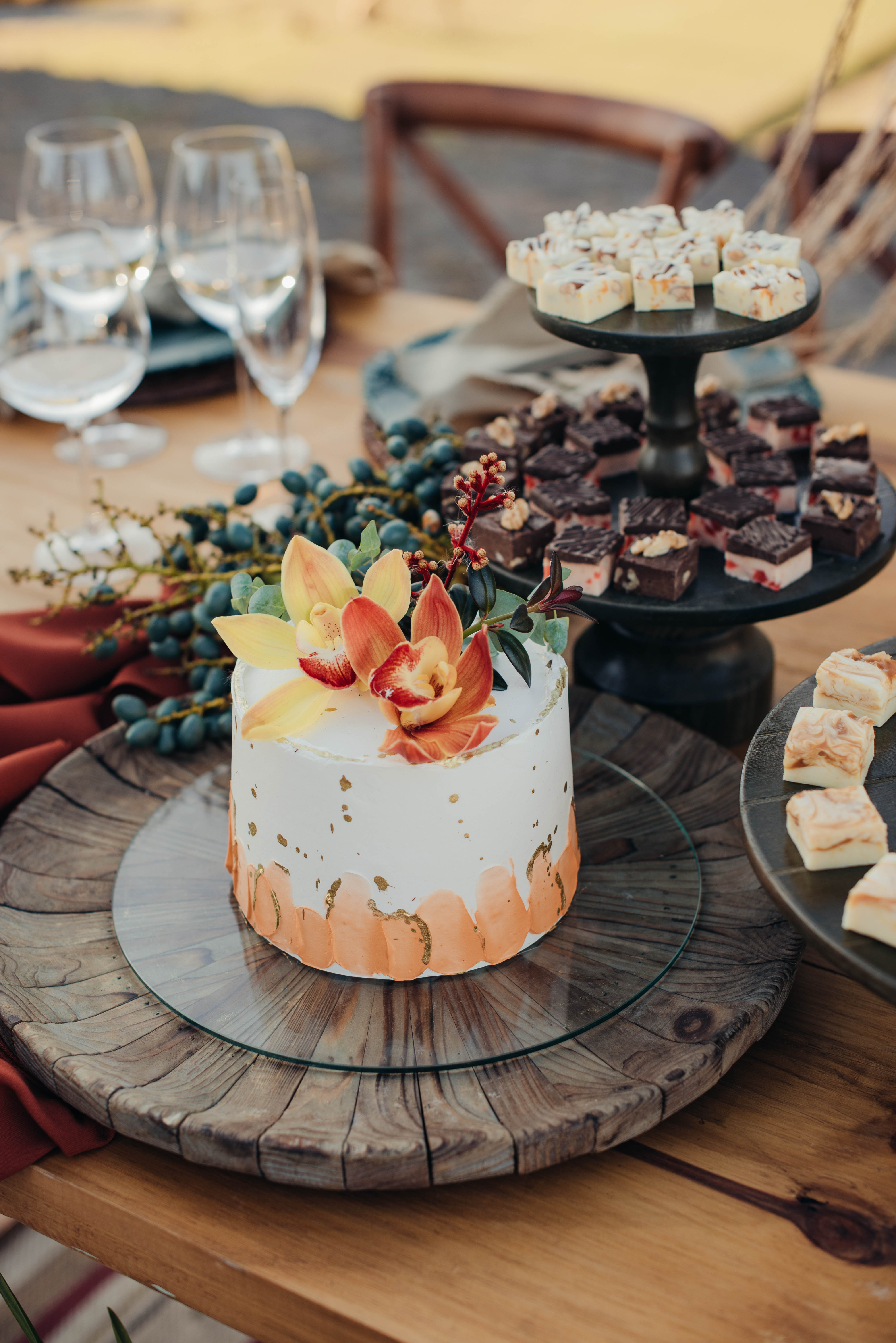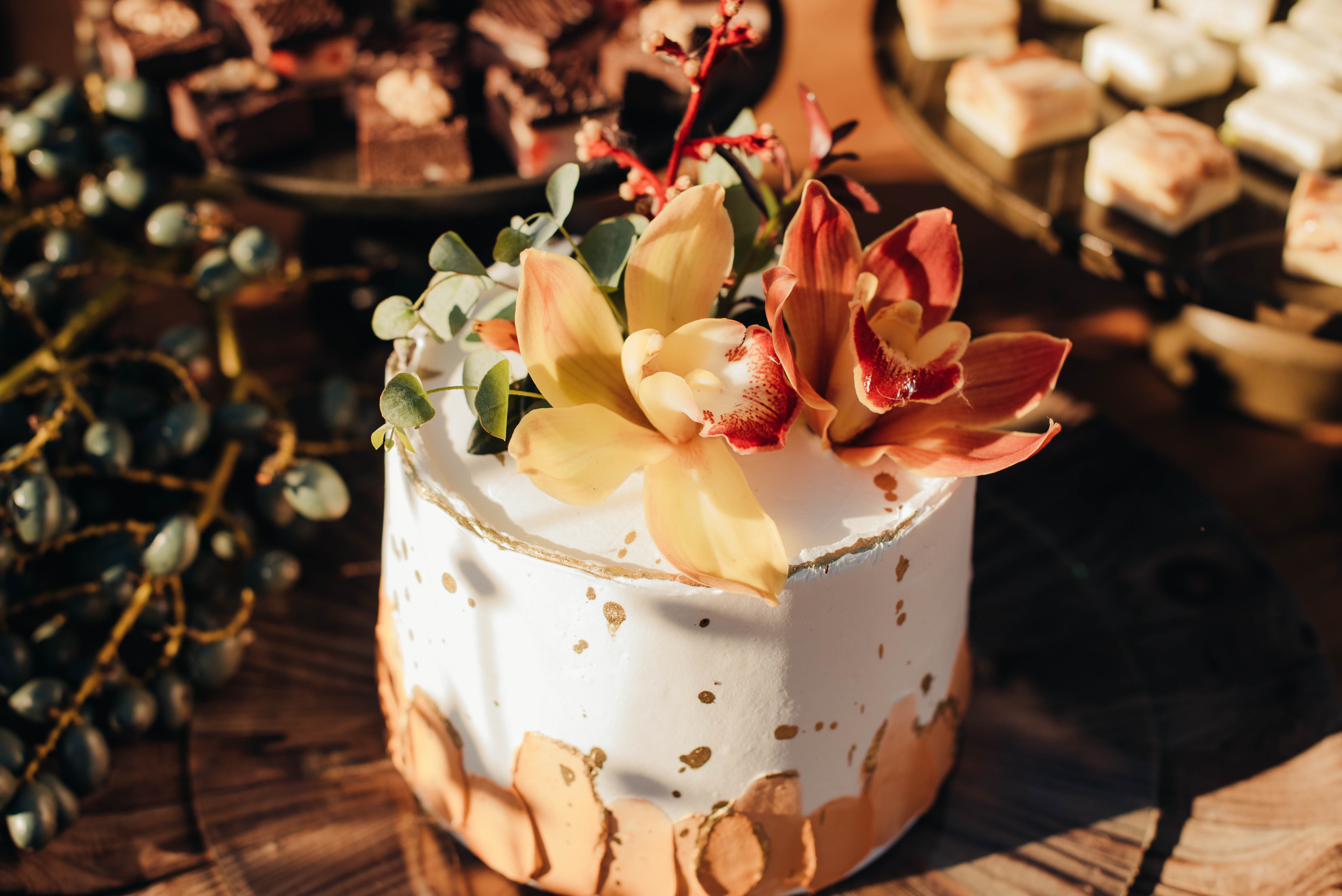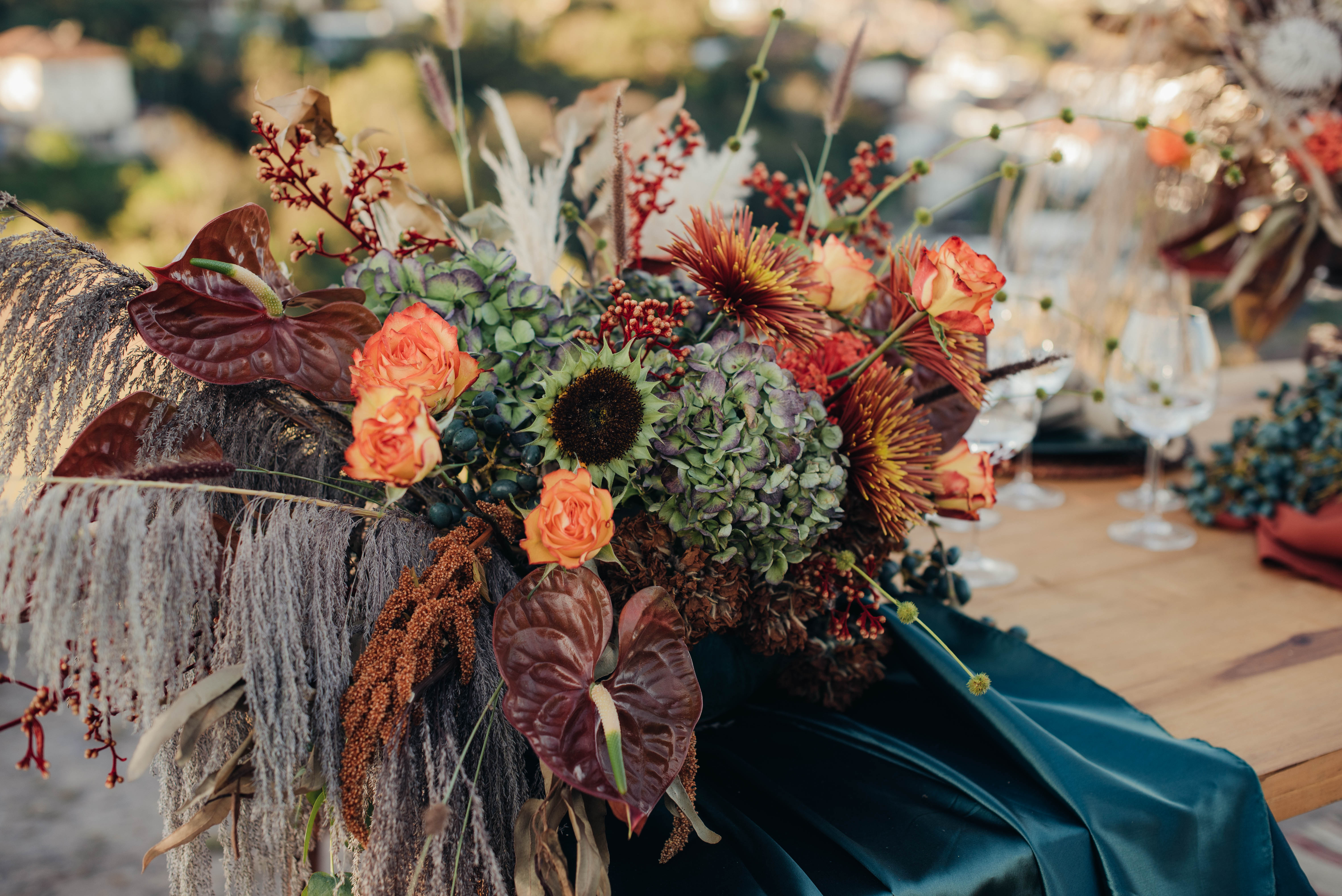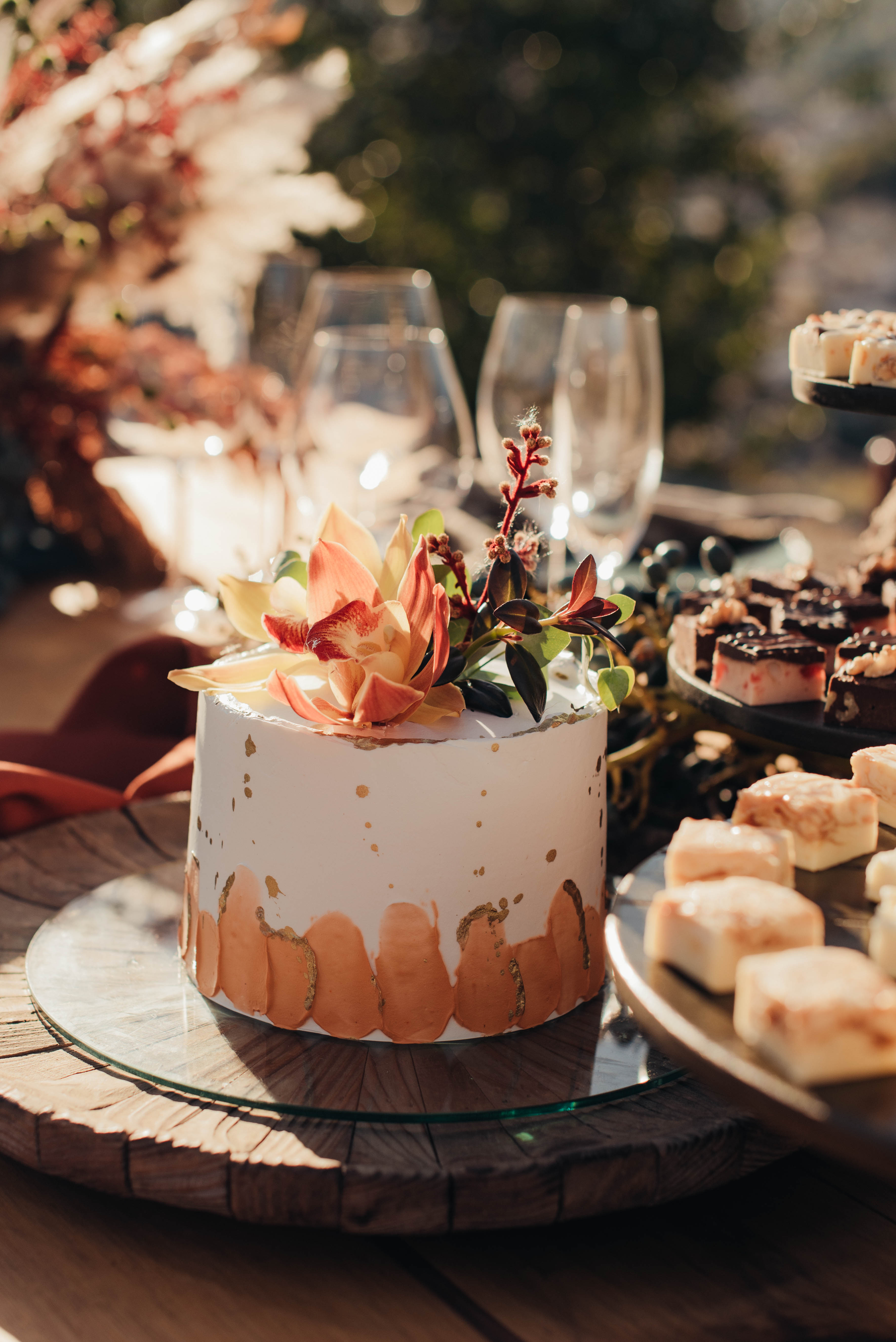 O Gil e o Alexandre (Purpurata Flor e Decor) aproveitaram as cores desse cenário e desenvolveram um projeto lindo em tons de terracota. O backdrop da cerimônia teve tons mais neutros que, combinado à mistura de texturas, só valorizou a paisagem de Ouro Preto e os tons do inverno. Para a mesa posta, os meninos usaram as cores quentes em contraste com um pouco de verde, que valorizou o bolo da Renata Tropia e os doces da Rara Bala Delícia.
