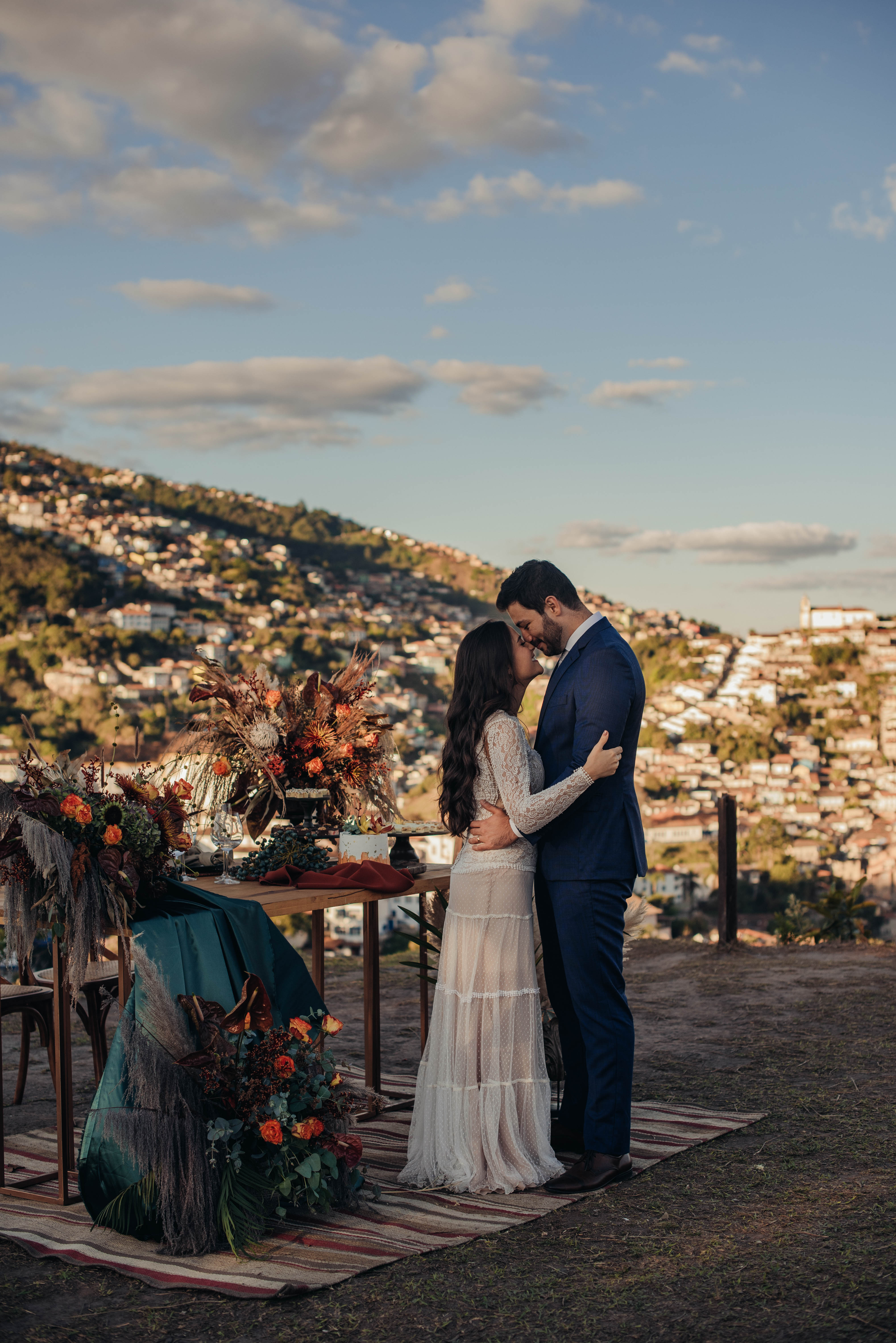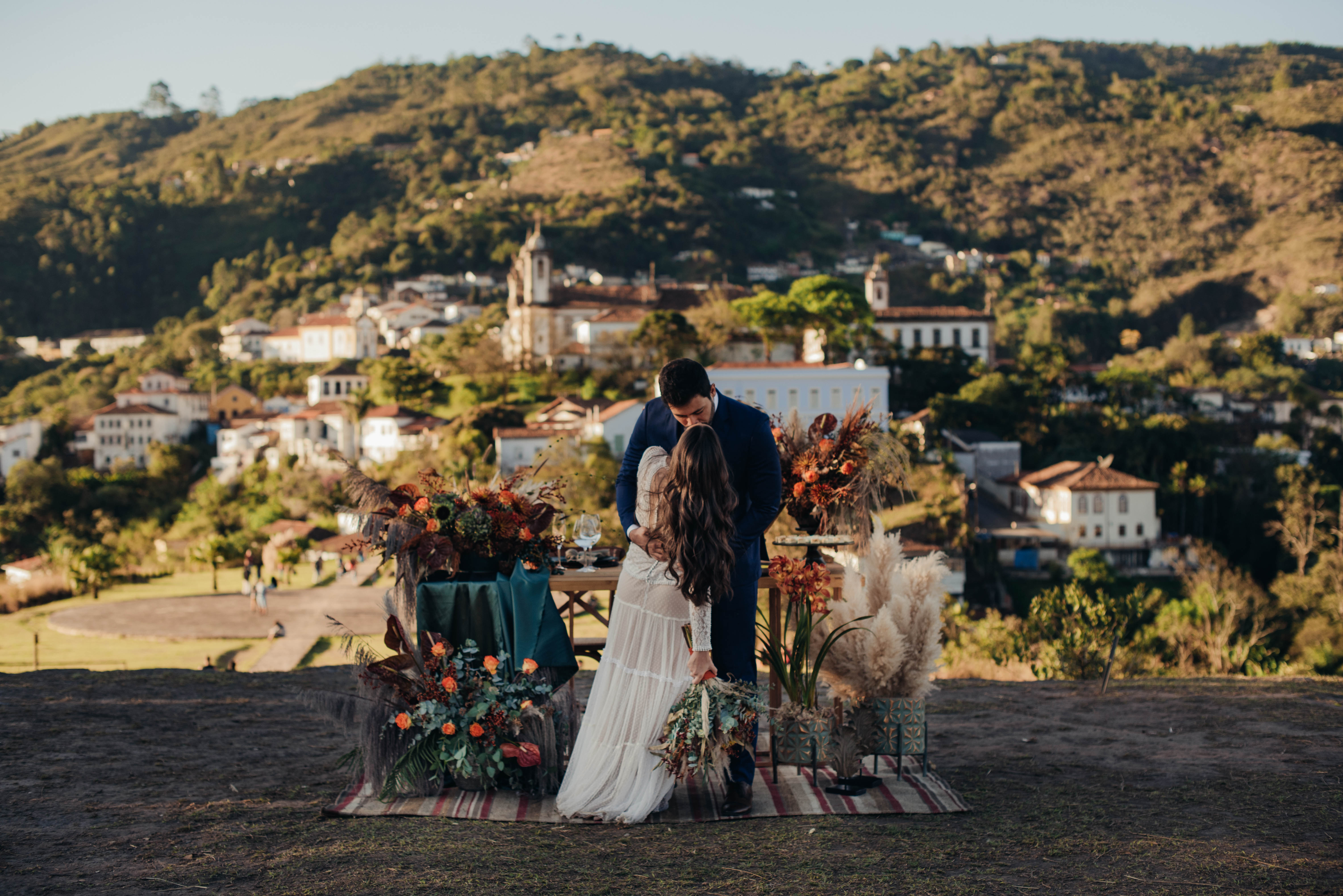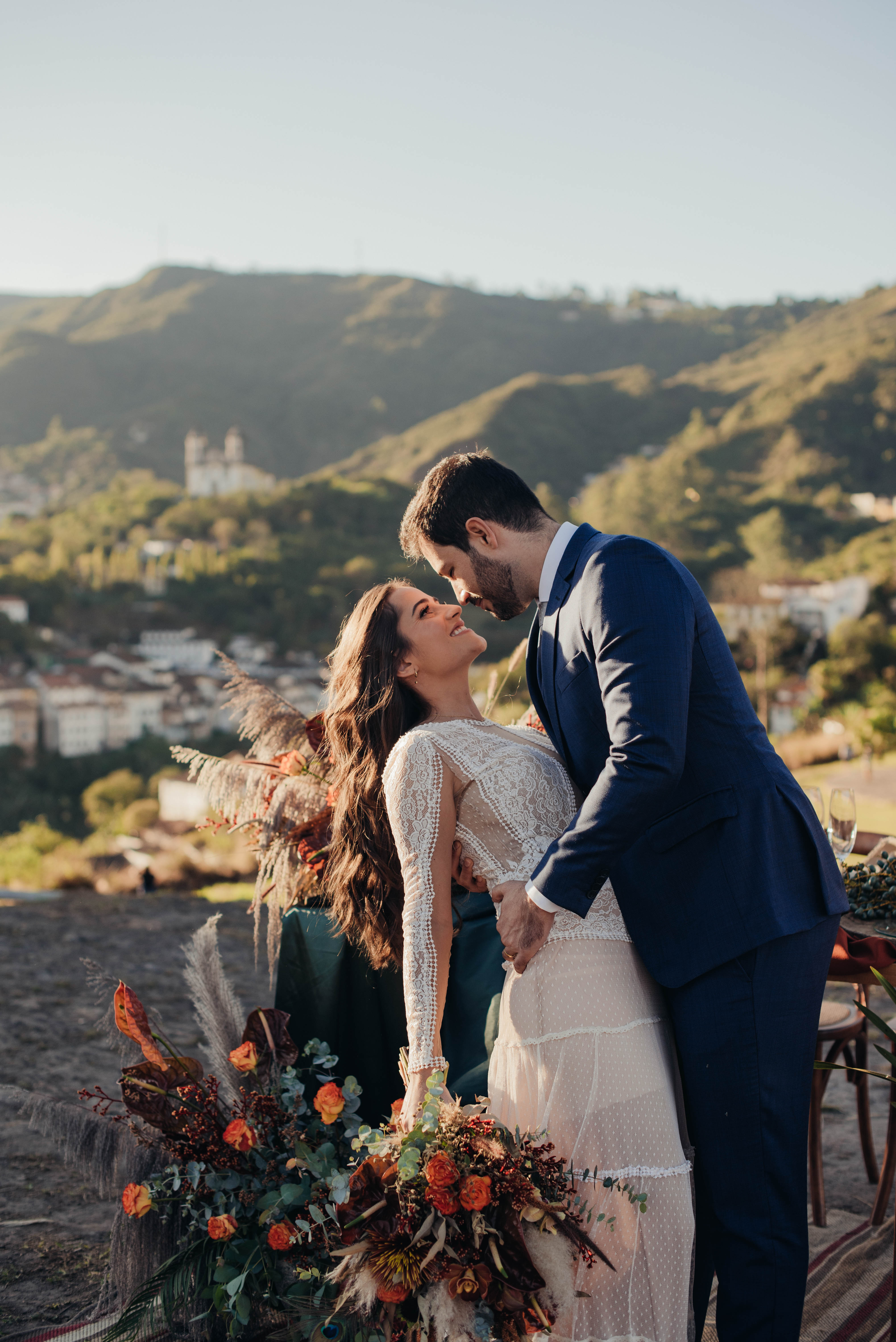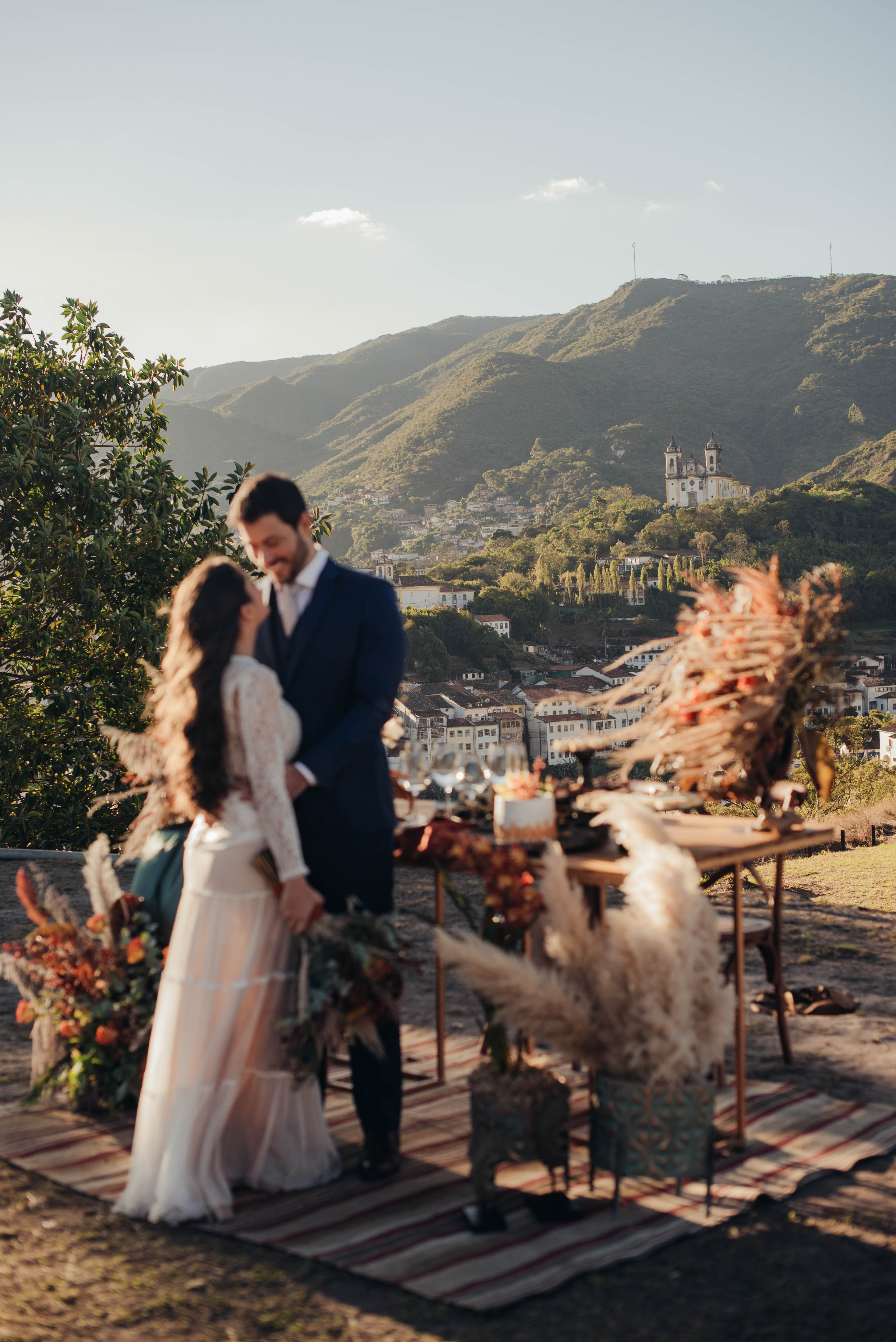 E aí entra a pesquisa e criatividade de uma equipe que trabalhou à distância, mas completamente conectada. A Paula (da Paula Peçanha Fotografia) e o Daniel (da Free Soul Filmes) tiveram um olhar muito sensível, e uma sacada sensacional de indicar o lugar que tem a luz e a vista 360 graus, mais bonita de Ouro Preto: o Morro da Forca.