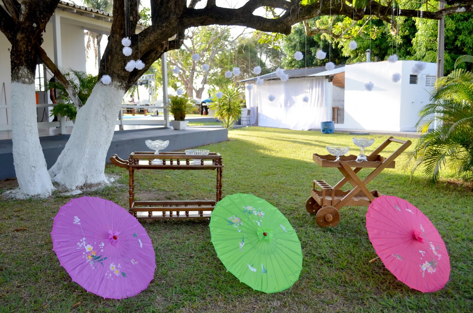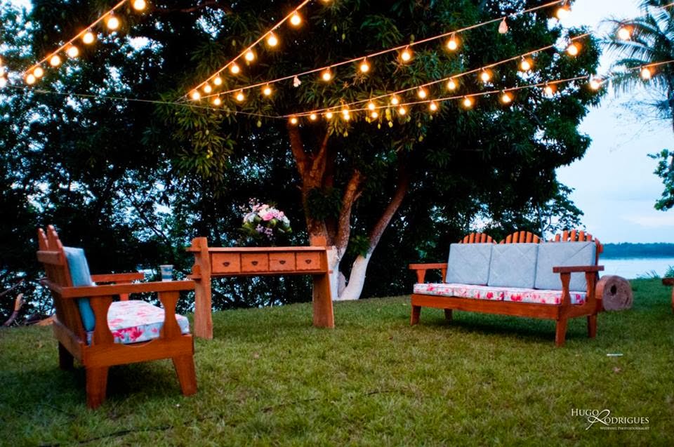 Pensamos em algo bem nosso, com nossos gostos e preferências. Por isso, em cada detalhe podia-se ver a nossa cara, o nosso jeitinho. Escolhemos casar no campo, em uma chácara pertinho da cidade, no fim da tarde com o Rio Tocantins ao fundo e toda a natureza ao redor para testemunhar nosso grande dia. Quisemos cuidar de cada detalhe, então a festa foi bem no estilo ‘handmade’ mesmo. Desde as corsages das madrinhas, o chaveirinho de coração nos leques, os cones de flores para saída dos noivos, a árvore cheiiinha de pompons e tantos outros mimos delicados e carinhosos escolhemos fazer cada um.