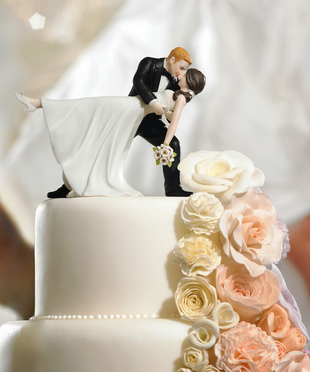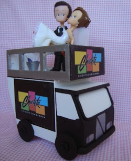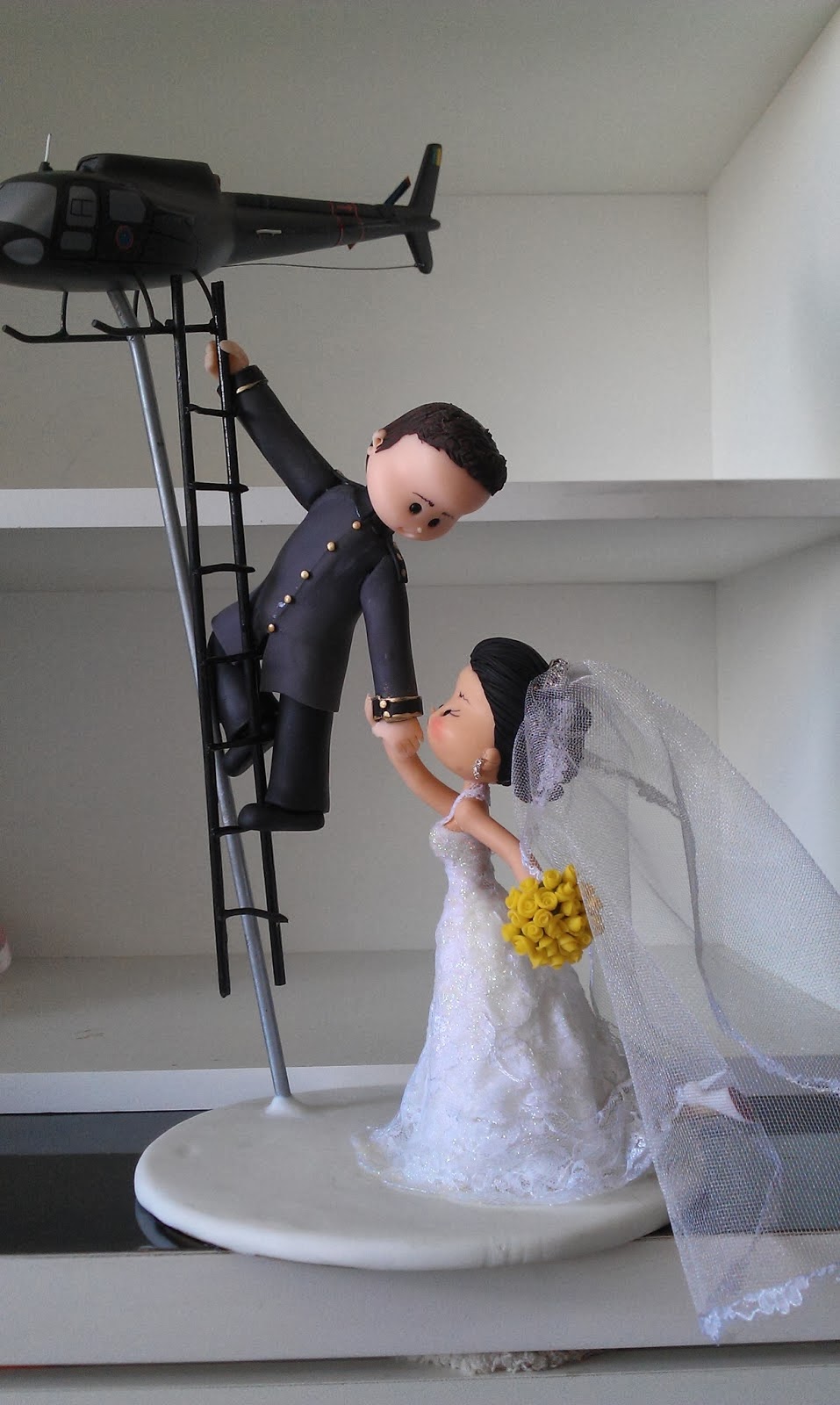 Biscuit: Uma excelente opção para casais que querem o topo de bolo mais personalizado. Existem fornecedores que são verdadeiros artistas (vide Mariléia Gregório). No biscuit é possível fazer caracteristicas como cor dos olhos, do cabelo e adicionar acessórios como óculos, relógios, brincos, colares, braceletes… Muitos noivos também pedem alguns objetos como livros, malas, placas… até trio elétrico eu já vi.