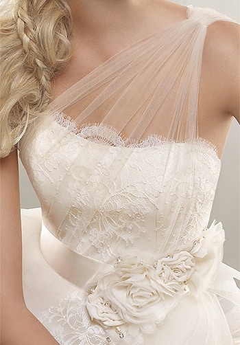 Existem inúmeras variedades de rendas, cada uma com sua própria trama e aparência. Eu amo a delicadeza da renda Chantilly, fios fininhos… Mas também a renda Alençon ou Veneziana. Gosto da feminilidade e do efeito singelo da renda para um casamento de dia. Par perfeito para o tule e organza.